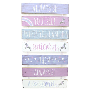 This gorgeous 7-tier multi-slatted wood sign, featuring a humorous and uplifting unicorn quote, is a great accessory for that magical unicorn themed nursery or kids room. This pretty piece of décor will add a touch of sparkle to any room!