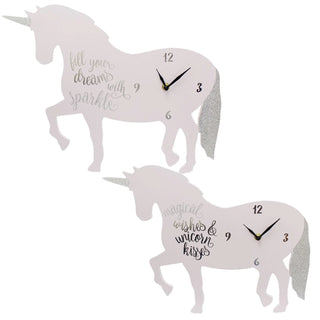 A beautiful decorative wall clock shaped like a magical unicorn. Complete with iridescent glittery unicorn horn and tail, it's both a great decoration and a good way to get children familiar with analogue time.