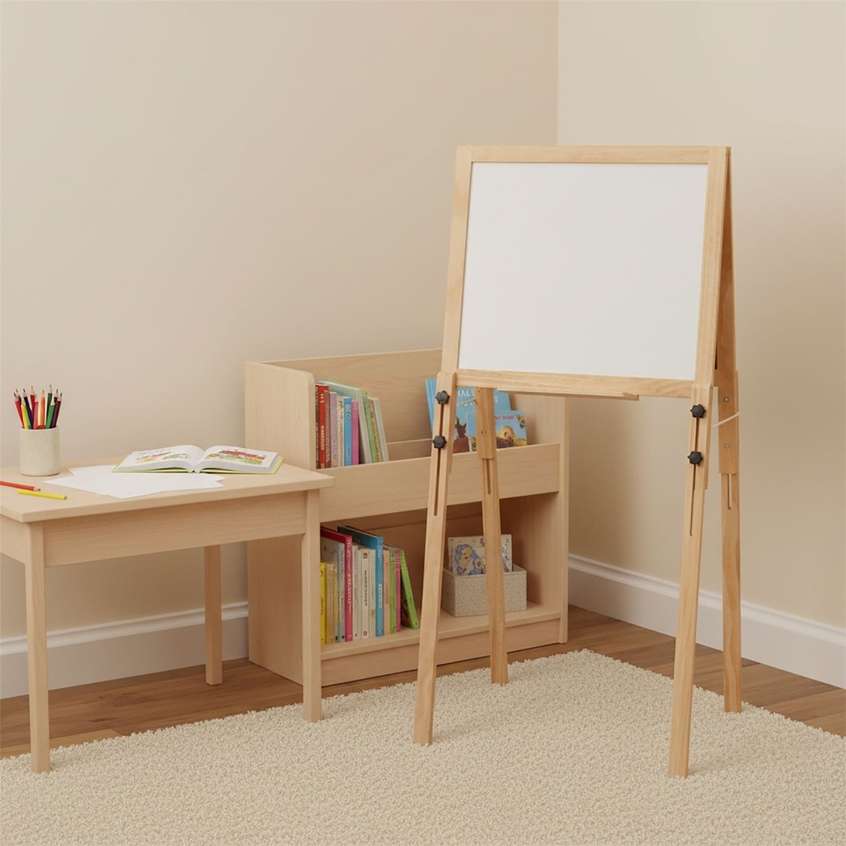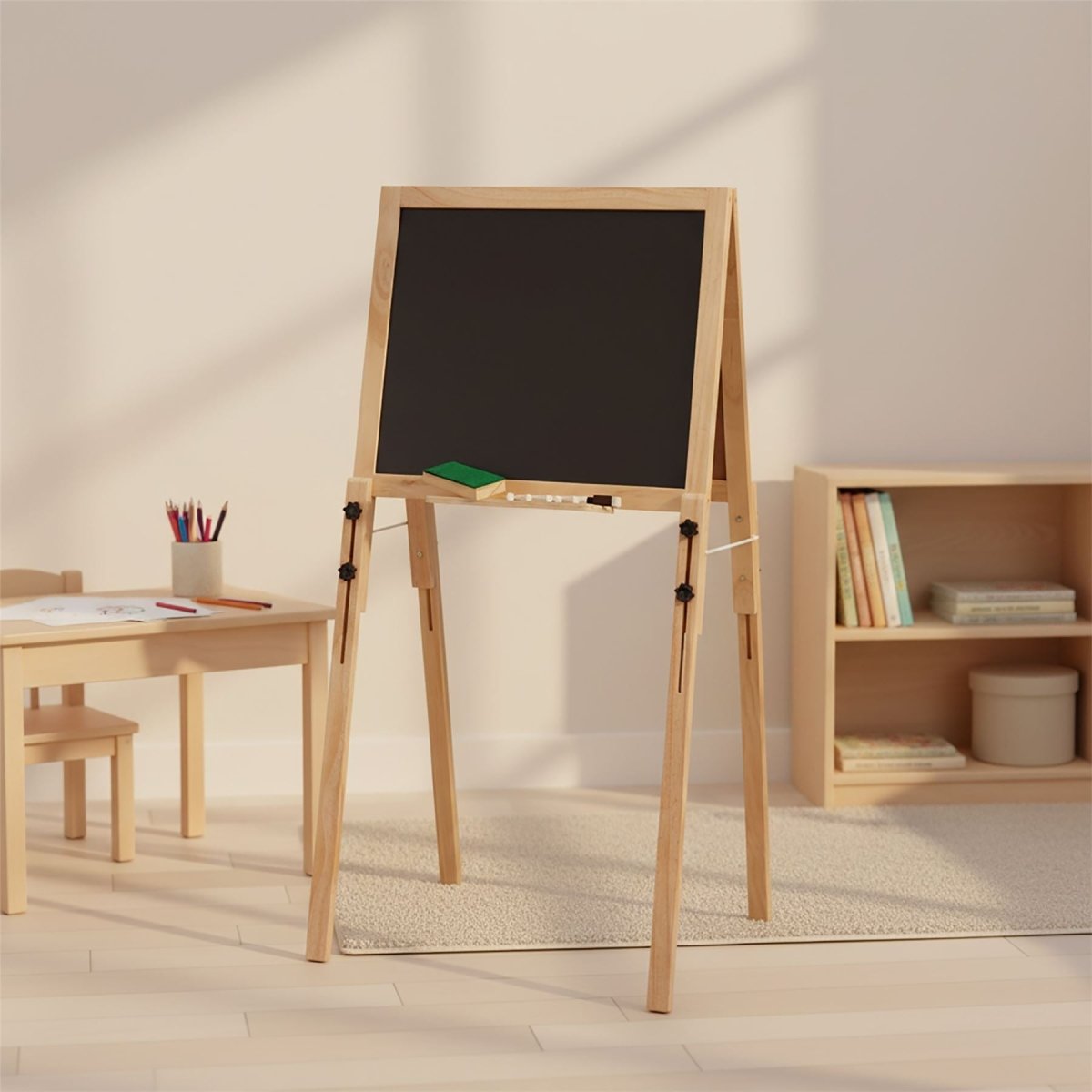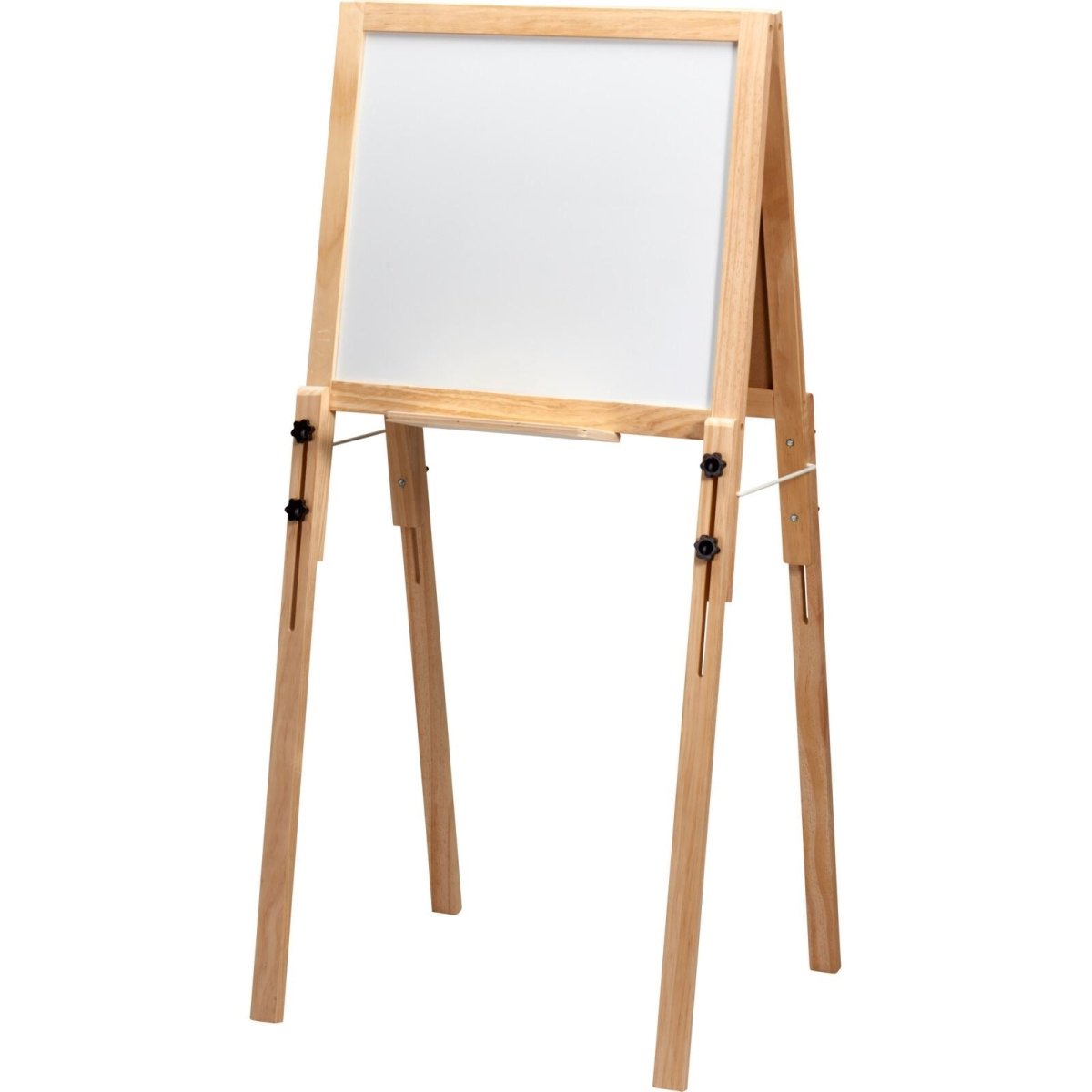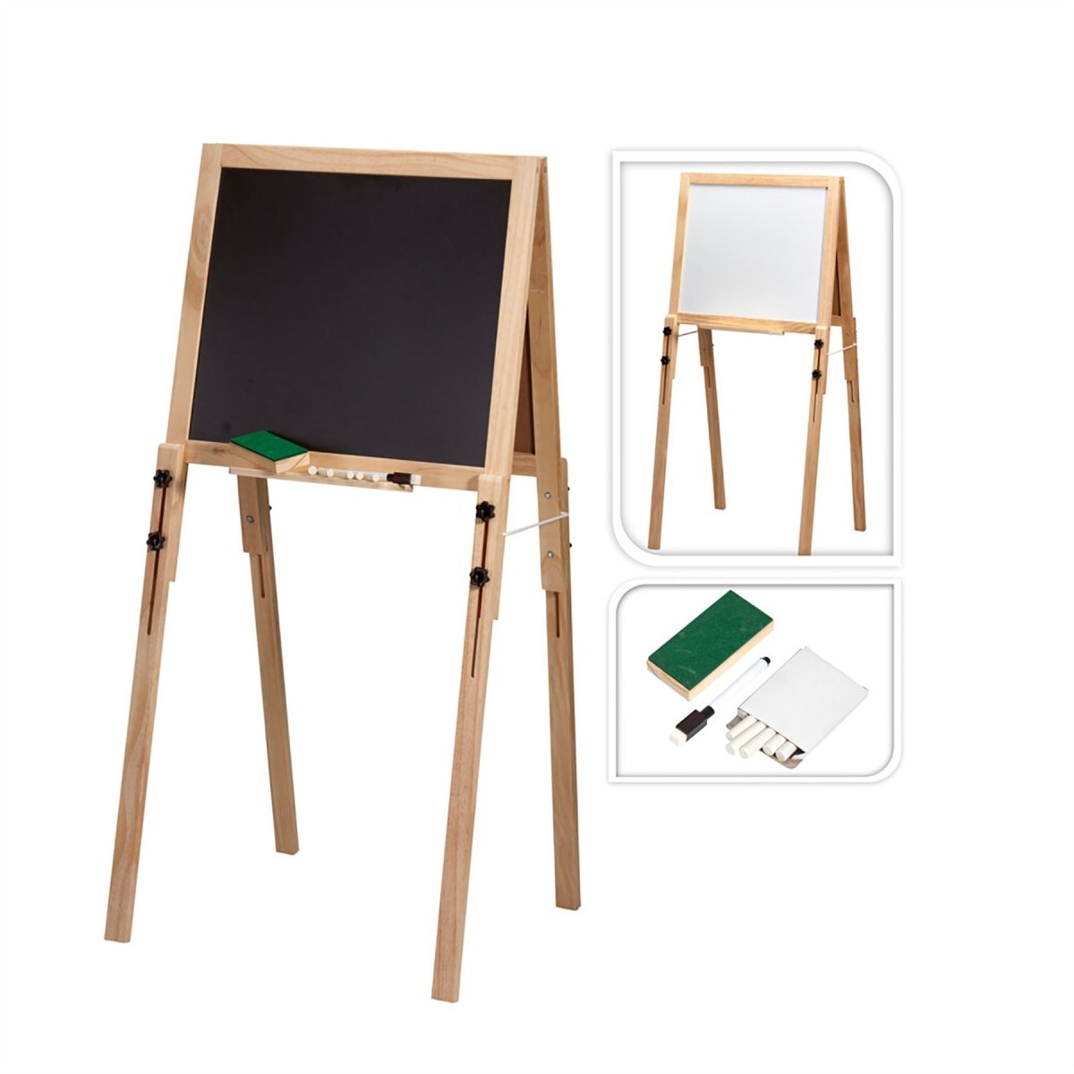 A double sided kids art easel with whiteboard/blackboard and adjustable height. Perfect for drawing, writing and learning through play