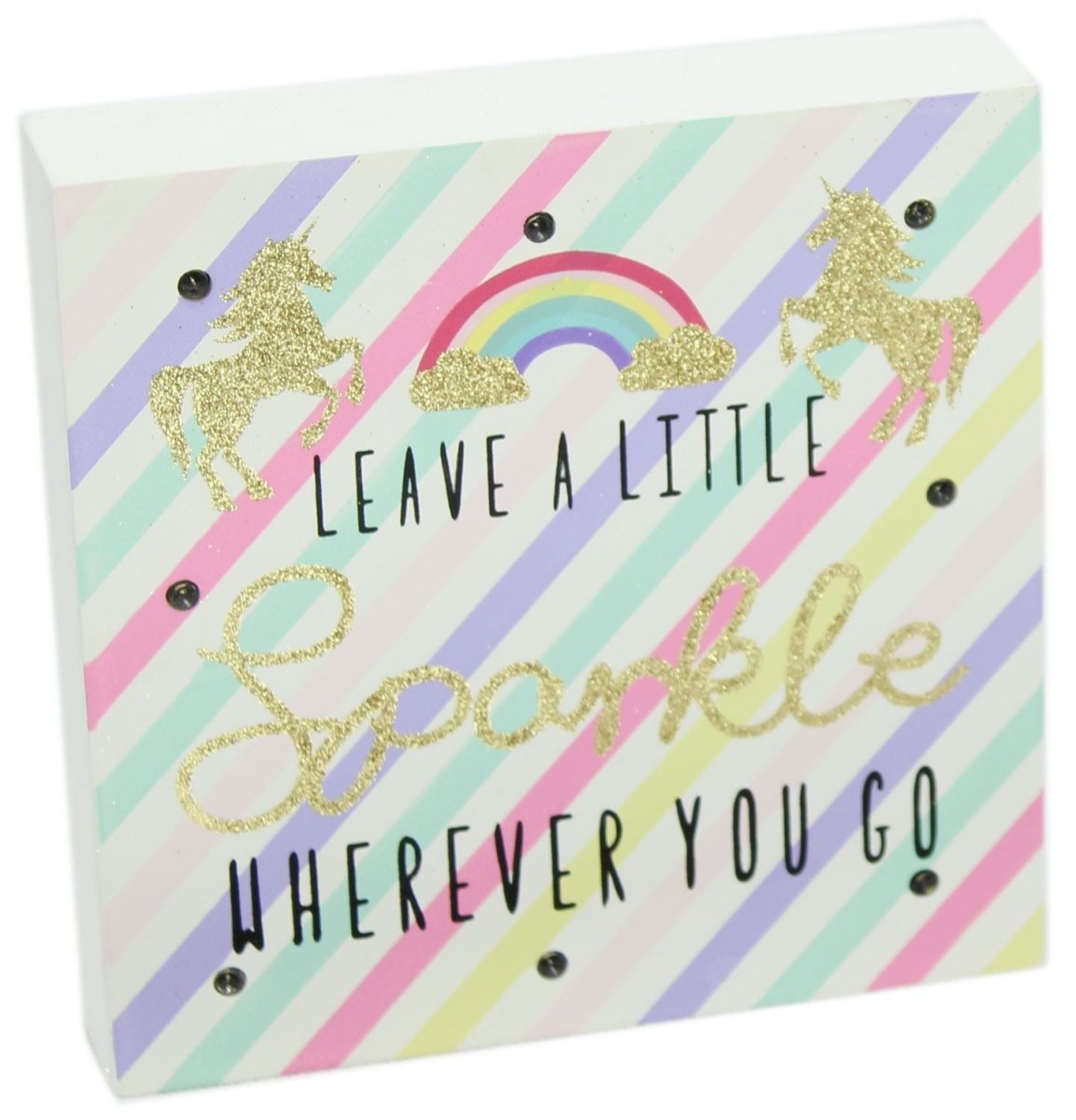 A magical wall plaque featuring a unicorn inspired quote. This wall plaque is covered in beautiful iridescent gold glitter. In addition to this it also lights up ~ truly magical. Plaque measures approximately 15cm x 15cm x 3cm