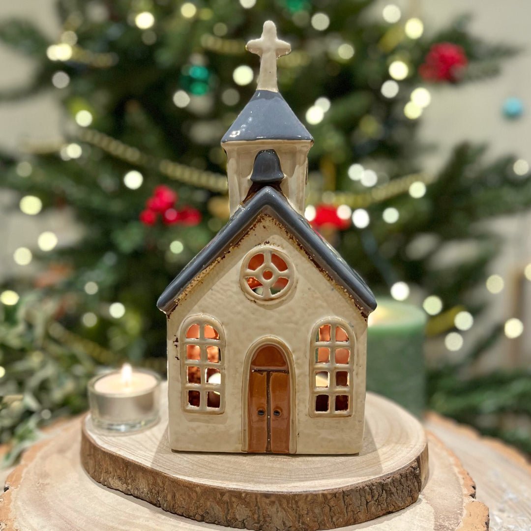 TEA LIGHT CANDLE DECORATION | This pretty pottery church has a wonderful rustic feel, the cream, grey and brown muted colour tones really add to the charm of this special piece