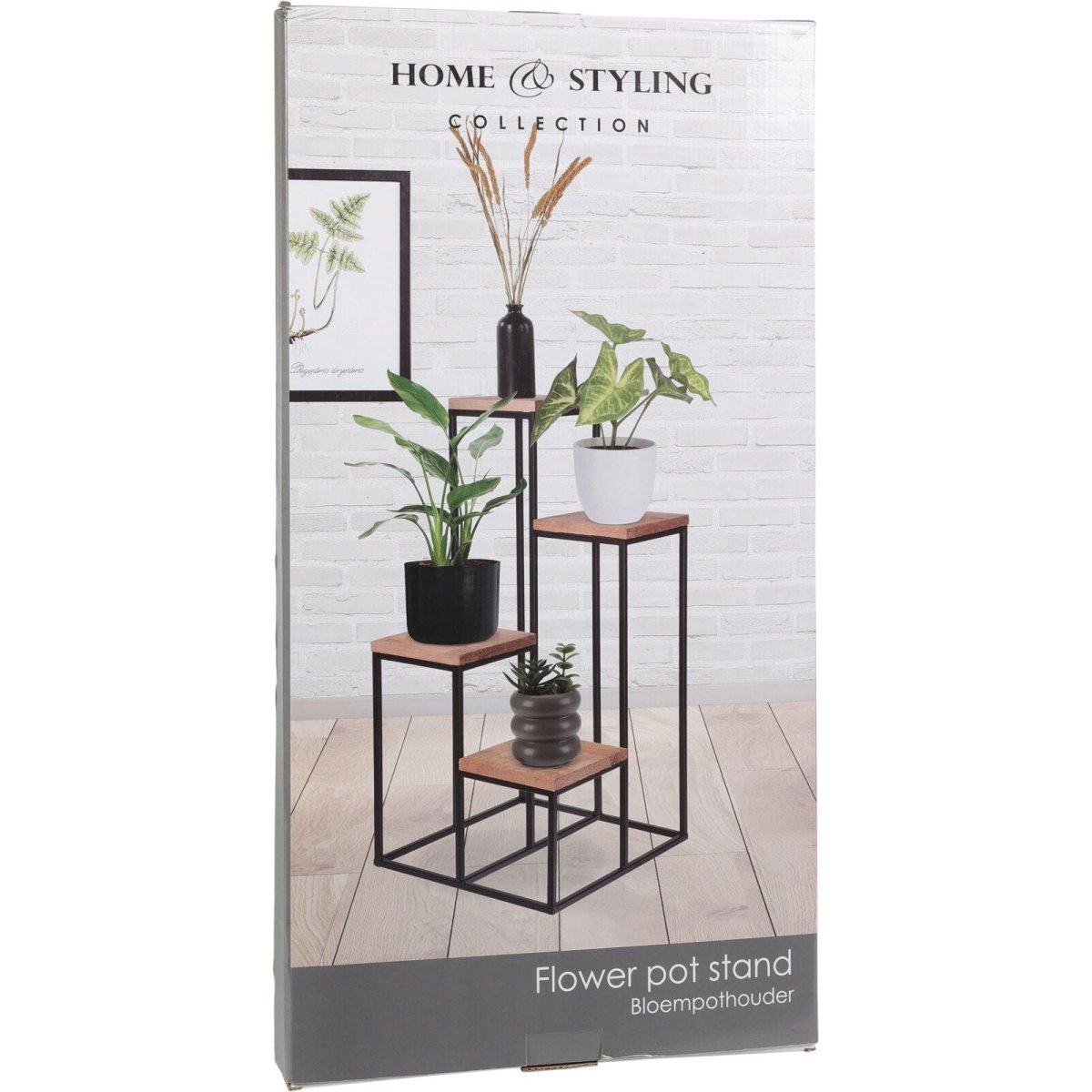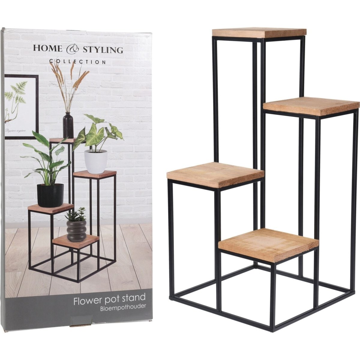 PLANT STAND | This elegant plant stand features four spacious shelves for displaying your favourite plants and decorative items. This flower stand blends natural wood and black metal to create a stylish, modern look that complements any interior. The natural wood shelves add warmth and charm, while the sleek black metal frame provides a contemporary touch