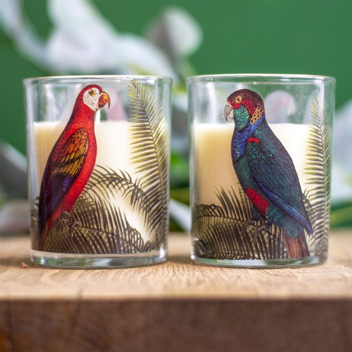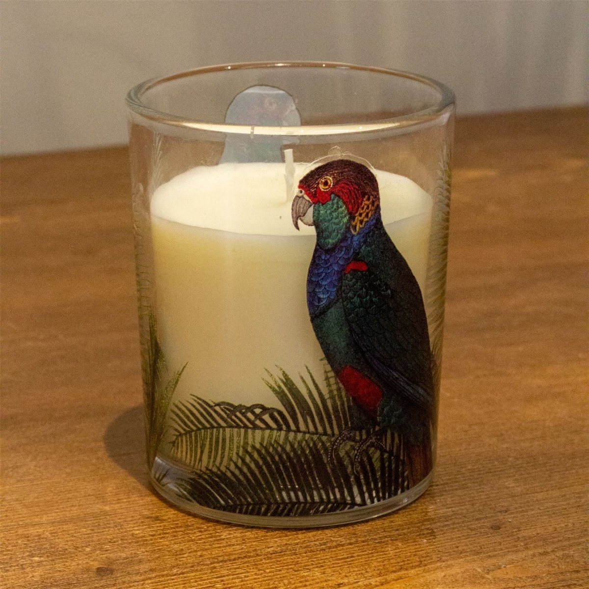 HOME DECOR | Crafted with care and presented in a charming glass pot featuring a stylish parrot design, this candle adds a touch of sophistication to any space it graces. Measures 8x10cm
