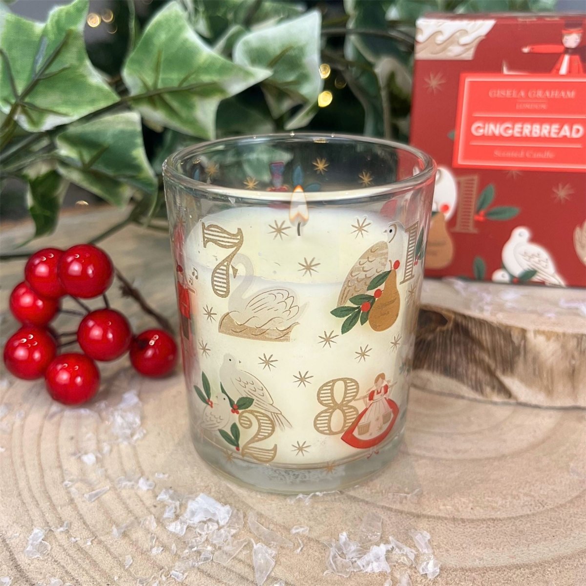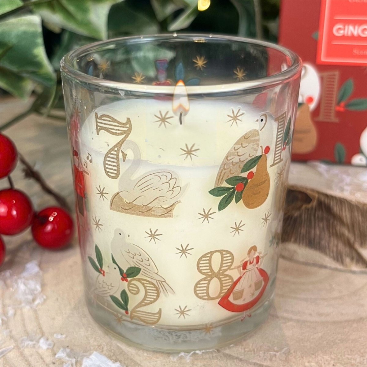 With its delightful gingerbread aroma and stunning glass holder adorned with the Twelve Days of Christmas motif, this candle is ideal for spreading holiday cheer or adding a touch of warmth to your home. Beautifully boxed, it makes an unforgettable gift for friends and loved ones, while the inviting scent and gentle glow create a cosy atmosphere perfect for any Christmas celebration