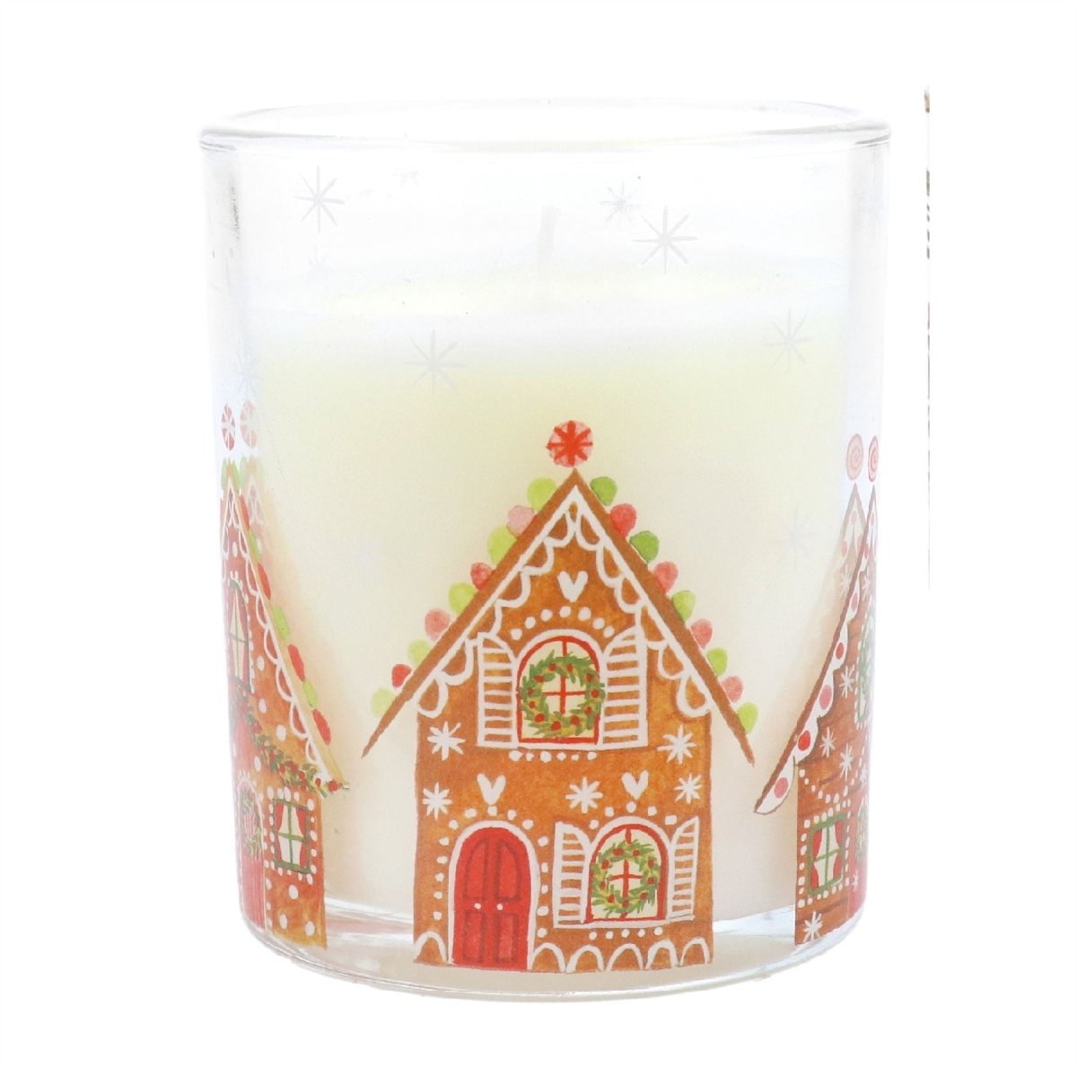 SCENTED CANDLE | Housed in glass holder adorned with colourful gingerbread houses and snowflakes, this candle adds a whimsical touch to your Christmas decor. Its vibrant design is sure to enhance any Christmas setting