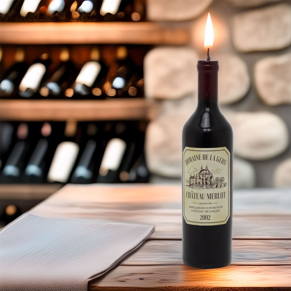 A red wine bottle shaped candle with a Chateau Merlot label, ideal for dining tables, gifting, or adding a touch of French inspired style. This novelty candle brings warmth, personality, and a fun twist to everyday home decor