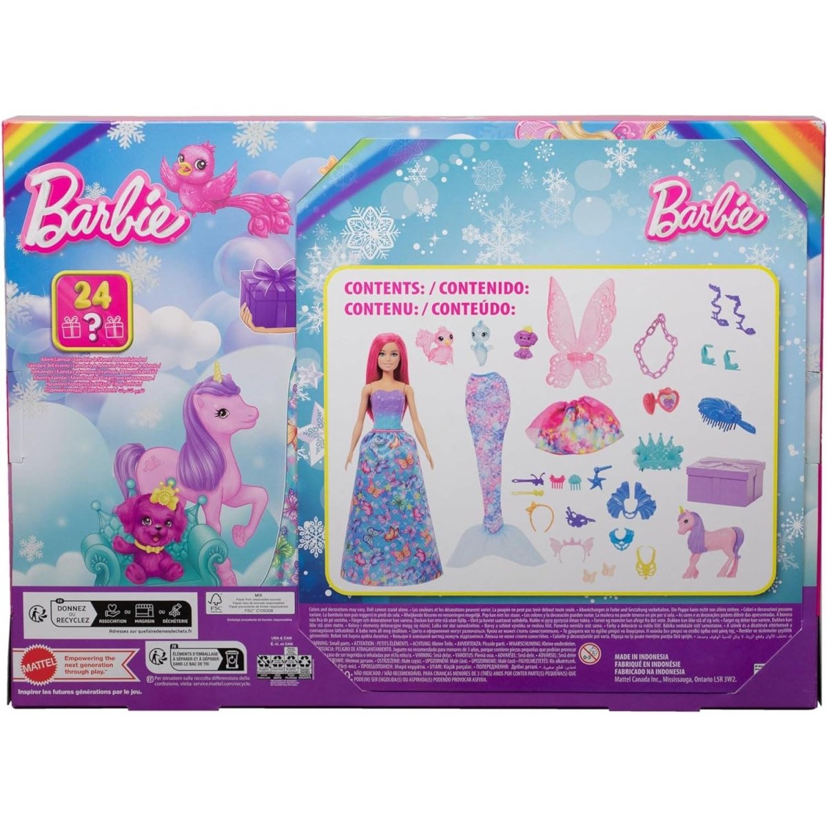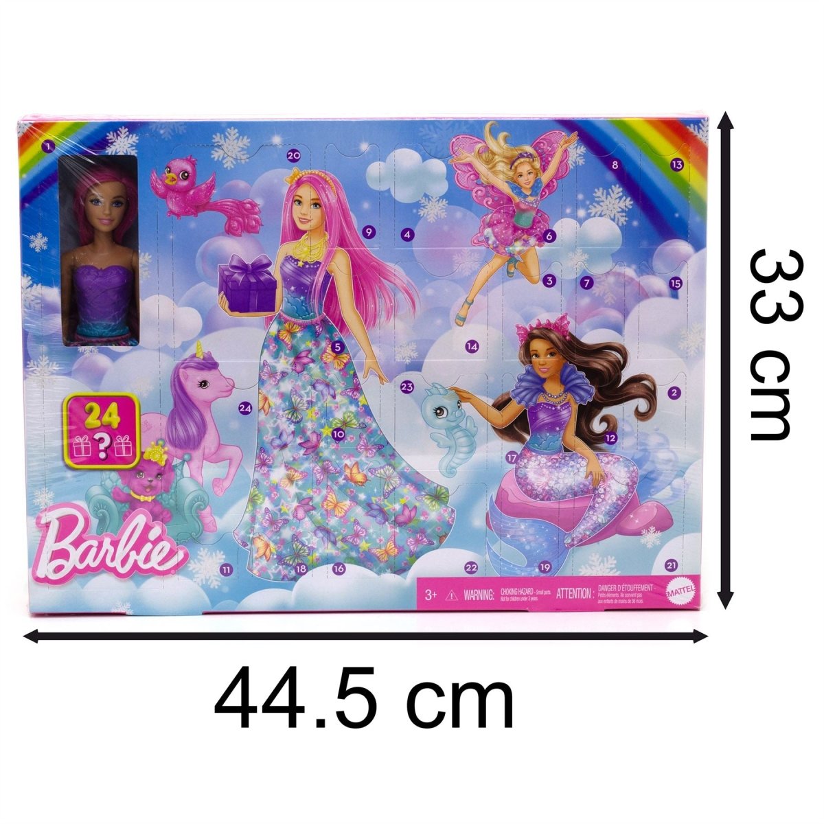 Celebrate the festive season with the Barbie Dreamtopia Christmas Advent Calendar! This magical set includes a pink-haired Barbie doll and 24 delightful surprises, such as mermaid tails, fairy wings, and enchanting fantasy pets