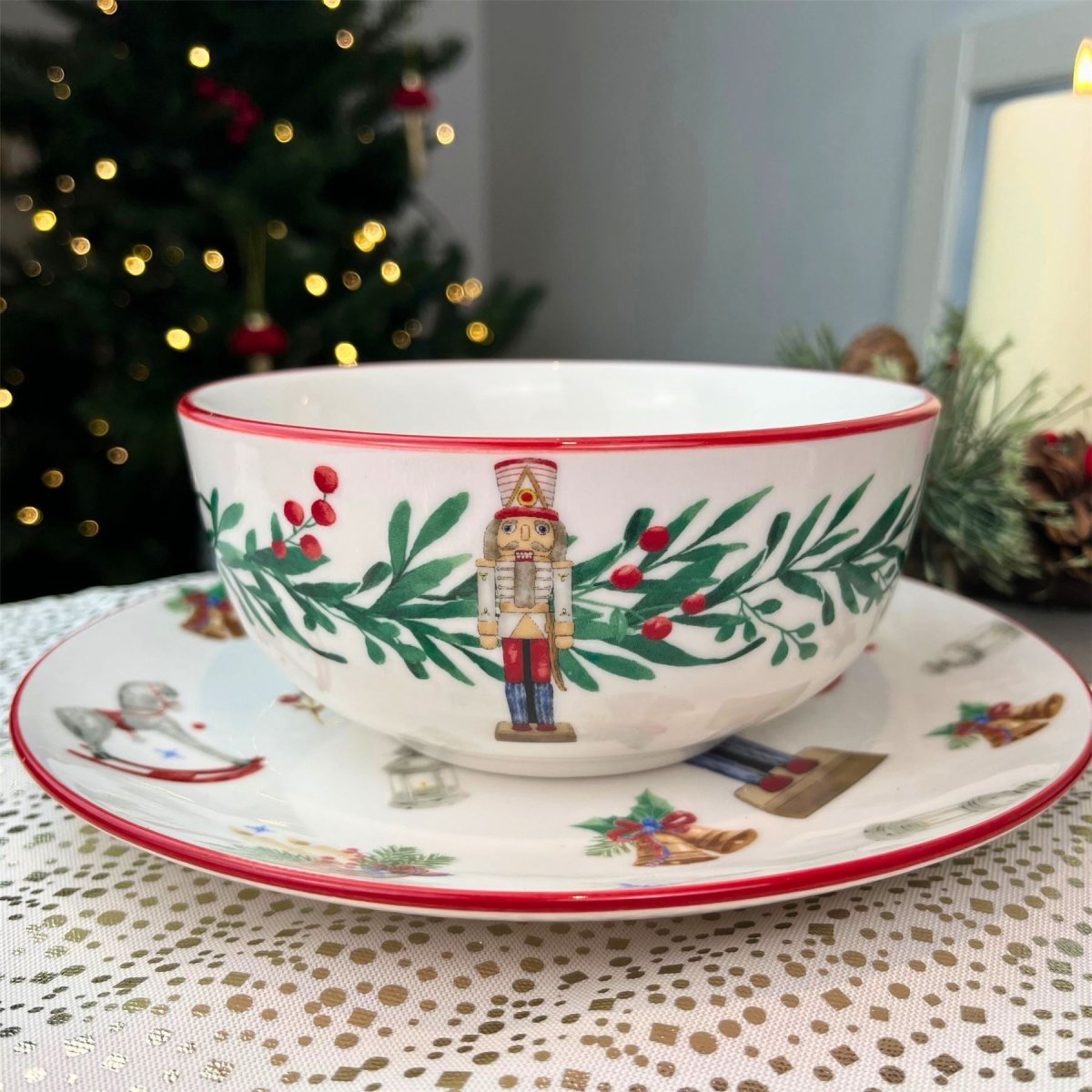 NUTCRACKER BOWL | Our charming ceramic Nutcracker Bowl adds a whimsical touch to your festive gatherings. Decorated with a nutcracker soldier, golden bells, and vibrant red berries, it’s designed to bring smiles and cheer to every table