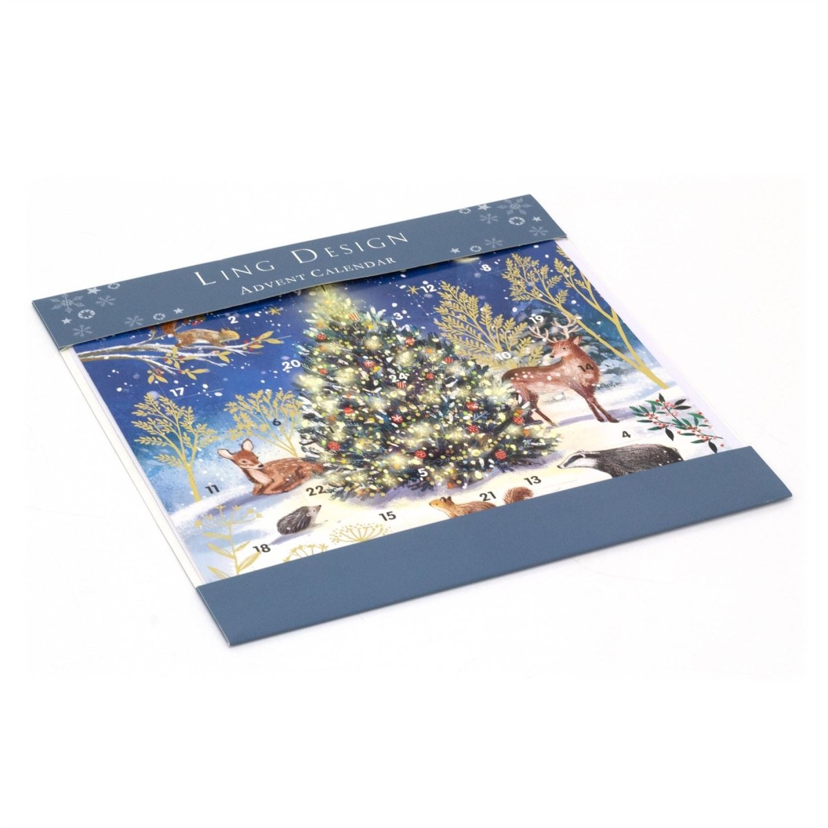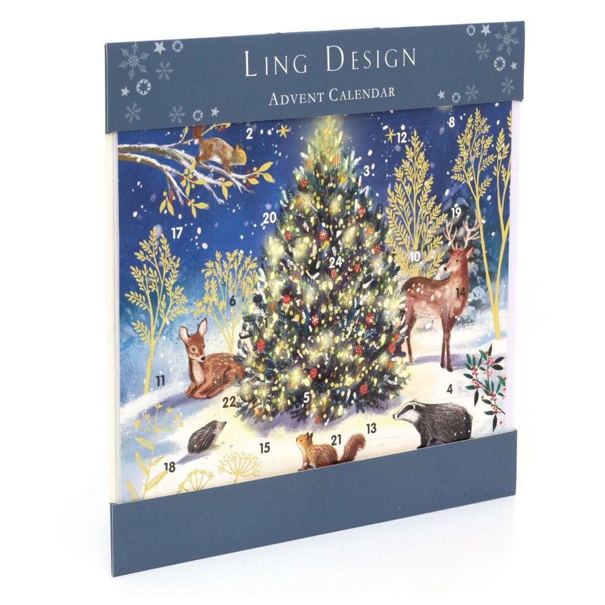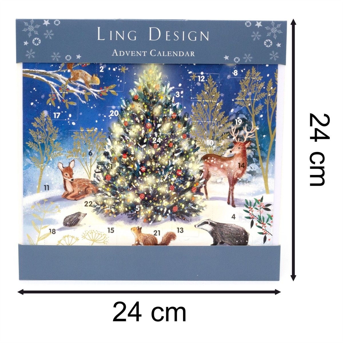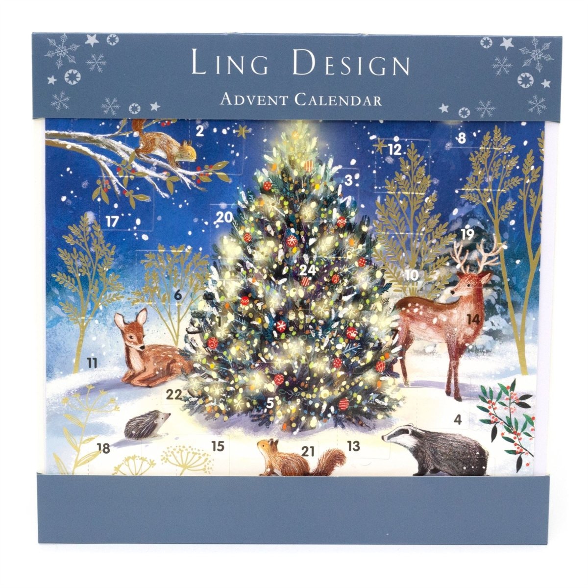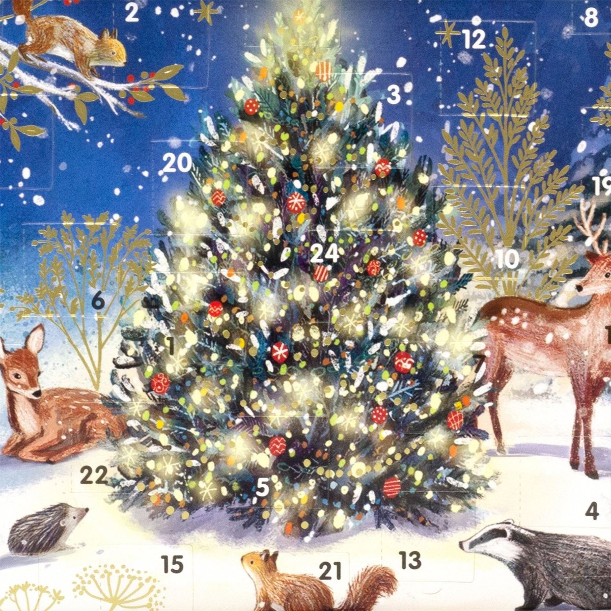 CHRISTMAS ADVENT CALENDAR | This charming Advent Calendar features a snowy woodland scene filled with enchanting forest friends like deer, badgers, hedgehogs, and squirrels, all gathered around a beautifully decorated Christmas tree