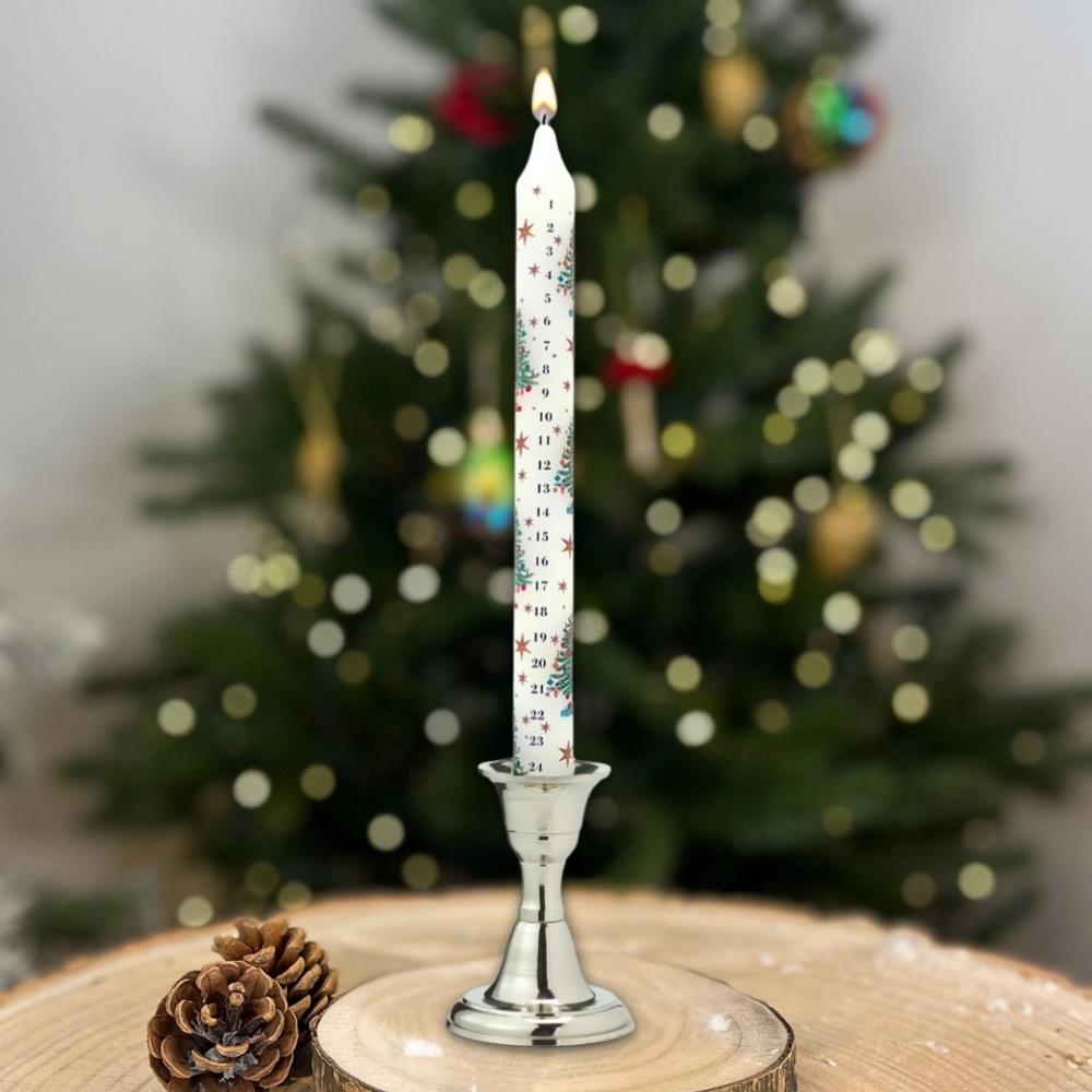 The Nostalgic Christmas Tree Advent Candle from Gisela Graham blends tradition with warmth. Decorated with vintage-style Christmas tree motifs and gold stars, this festive candle is numbered from 1 to 24, allowing you to burn it a little each day in December. Perfect for adding a golden glow to festive evenings, this 23cm dinner candle works beautifully on mantels, tables, or windowsills. A charming choice for lovers of classic seasonal décor, it also makes a thoughtful gift to share the magic of the countdown to Christmas.