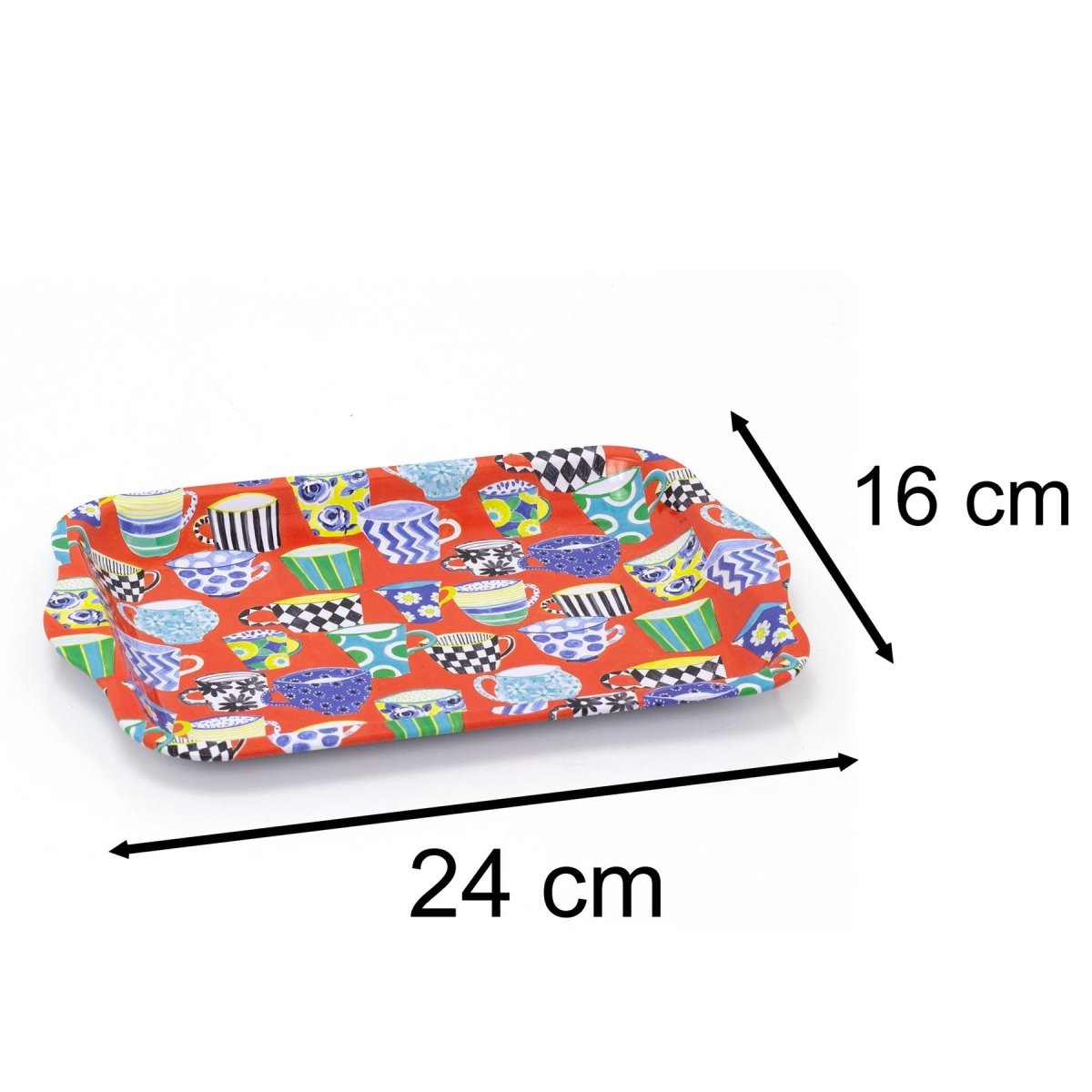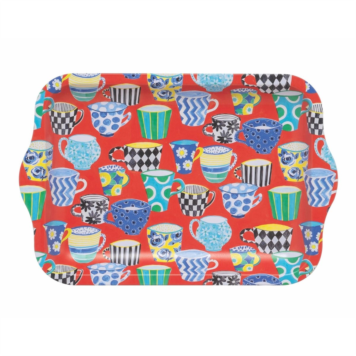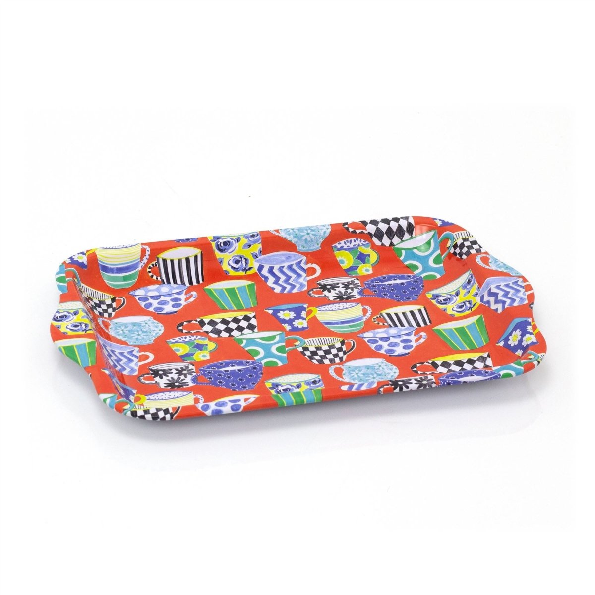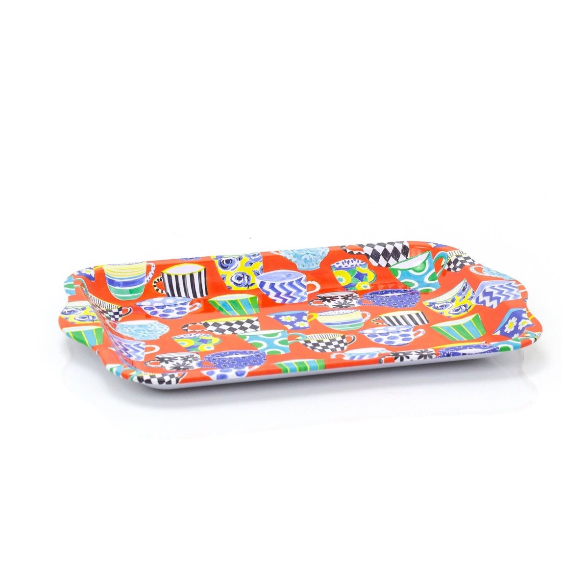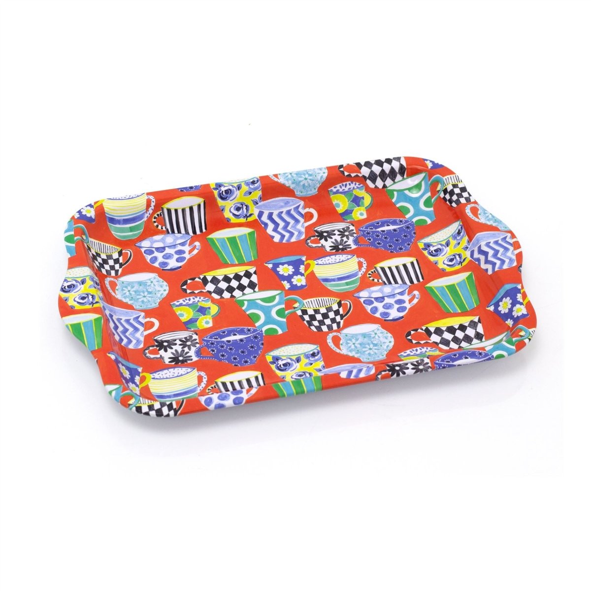 TIN TRAY | A delightful small tin tea tray for serving your favourite blend, colourfully decorated with tea cups in all shapes and sizes