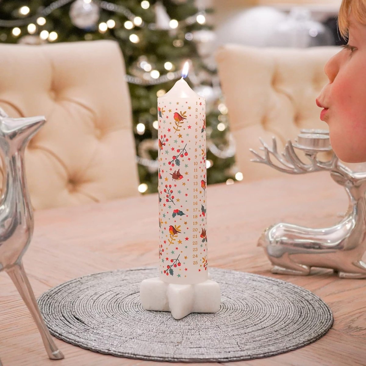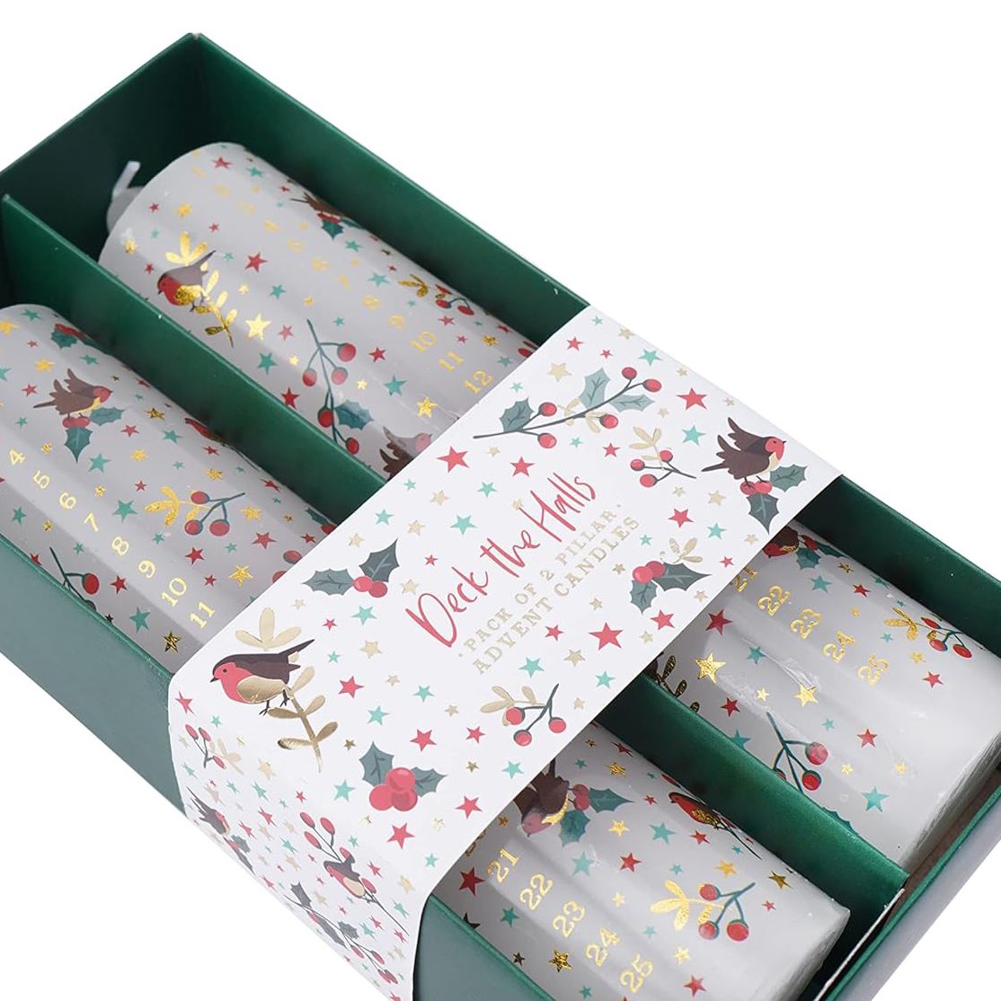 CHRISTMAS CANDLES | Embrace the holiday spirit with these beautiful Advent candles. Each candle is adorned with a festive sleeve featuring robins and holly, adding a touch of festive cheer to your daily countdown. Light them up to bring a smile as Christmas draws closer