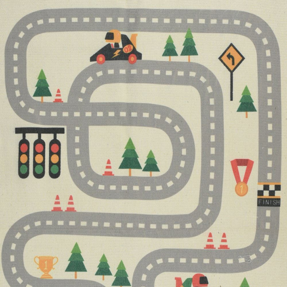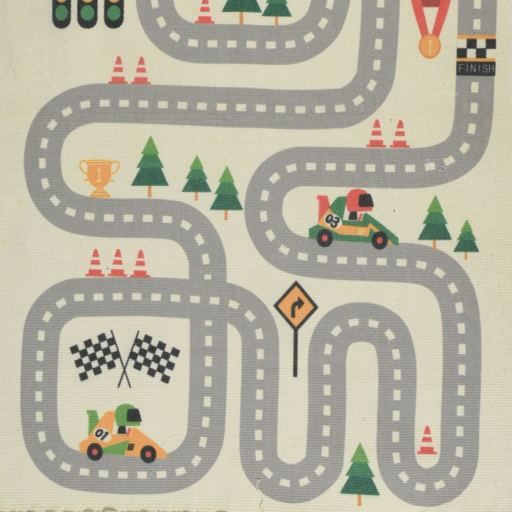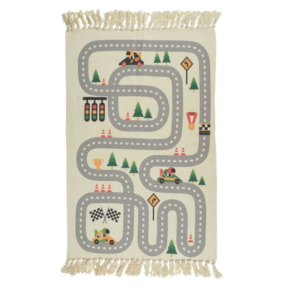 RACE TRACK RUG | Turn ordinary playtime into high-speed adventures with our children's race track rug! Watch as your little ones zoom cars along the track, navigating thrilling challenges and daring manoeuvres