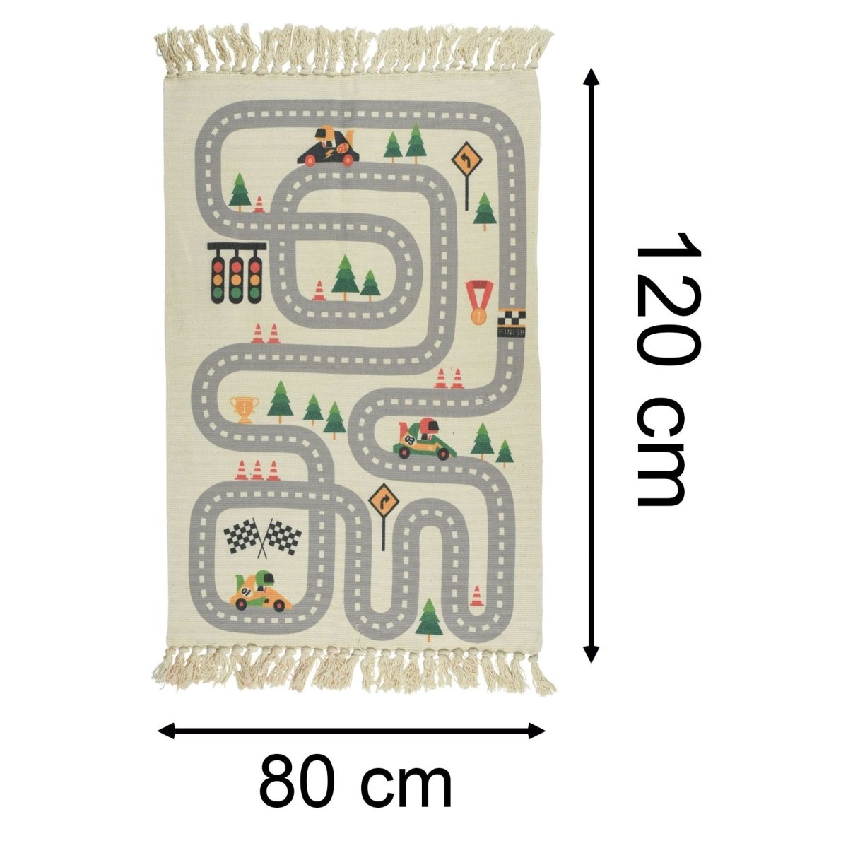 WHIMSICAL DESIGN | Measuring 80x120 cm, this charming beige rug features a vibrant race track design, complete with twists, turns, and exciting racing elements