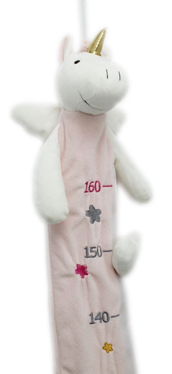 A magical unicorn height chart made from plush fabric featuring embroidered hearts and stars, and velcro measuring markers. The perfect addition to a child's bedroom, nursery or playroom