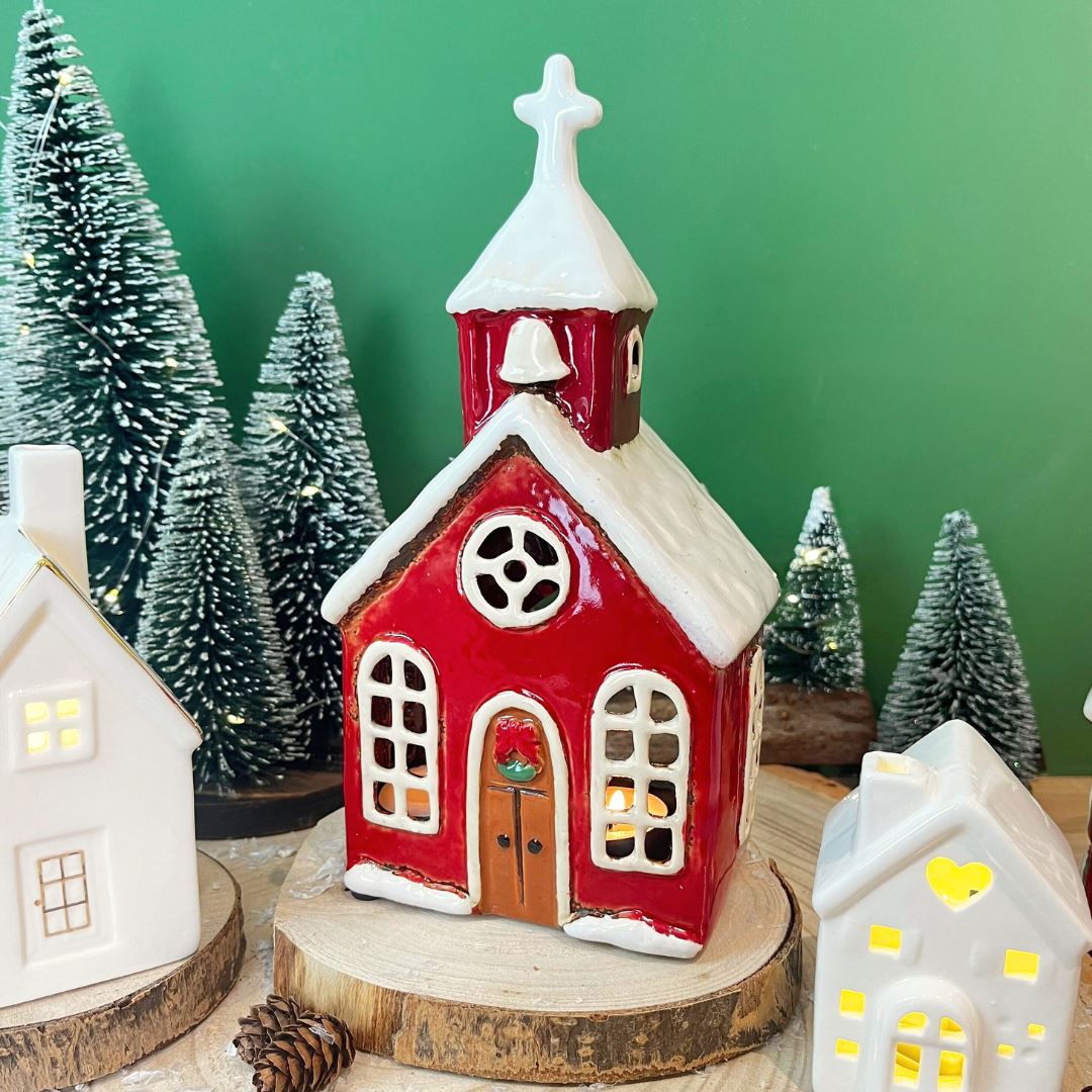 FESTIVE CHARM | Bring the spirit of Christmas to your home with this elegant red ceramic church tealight holder, topped with a snowy steeple and festive wreath