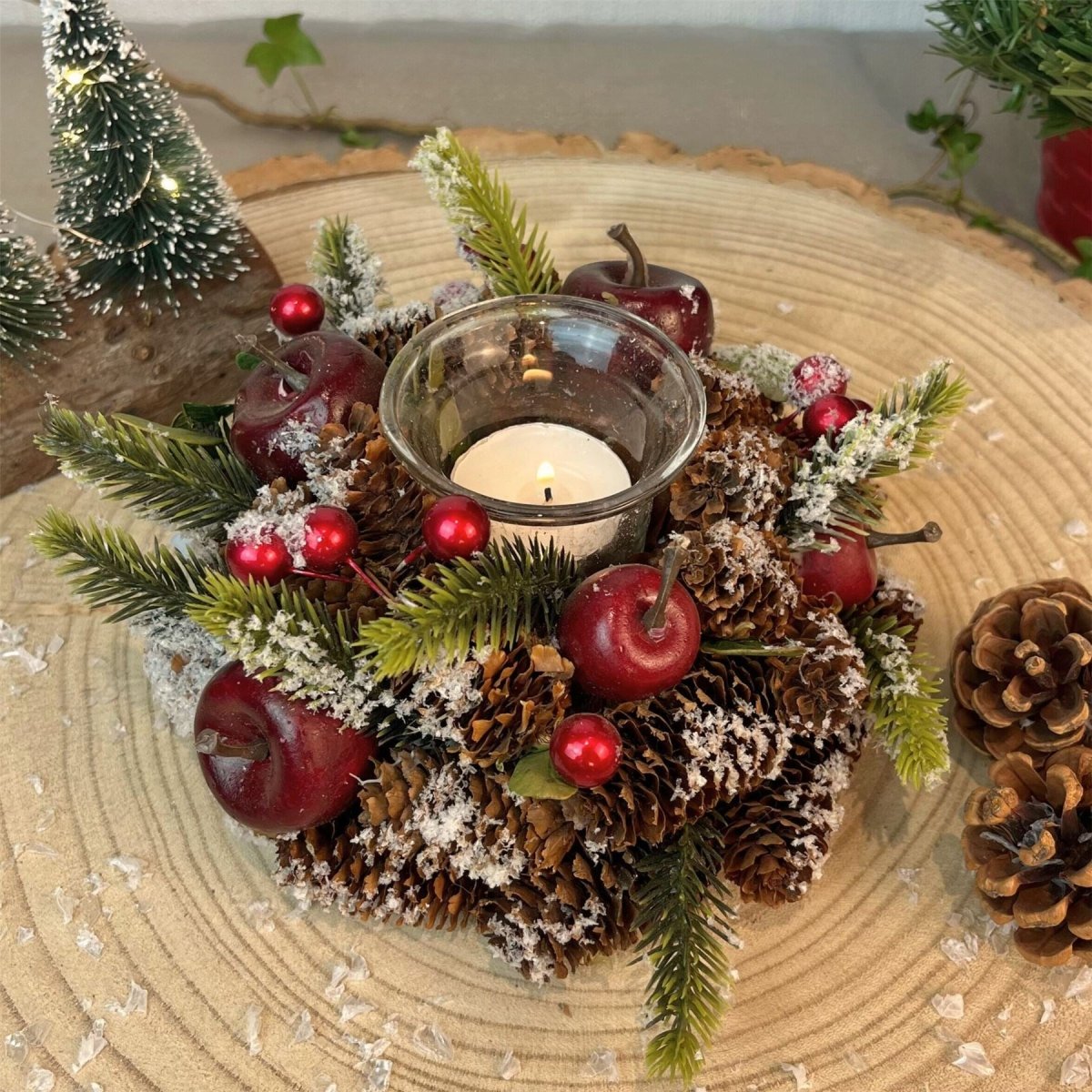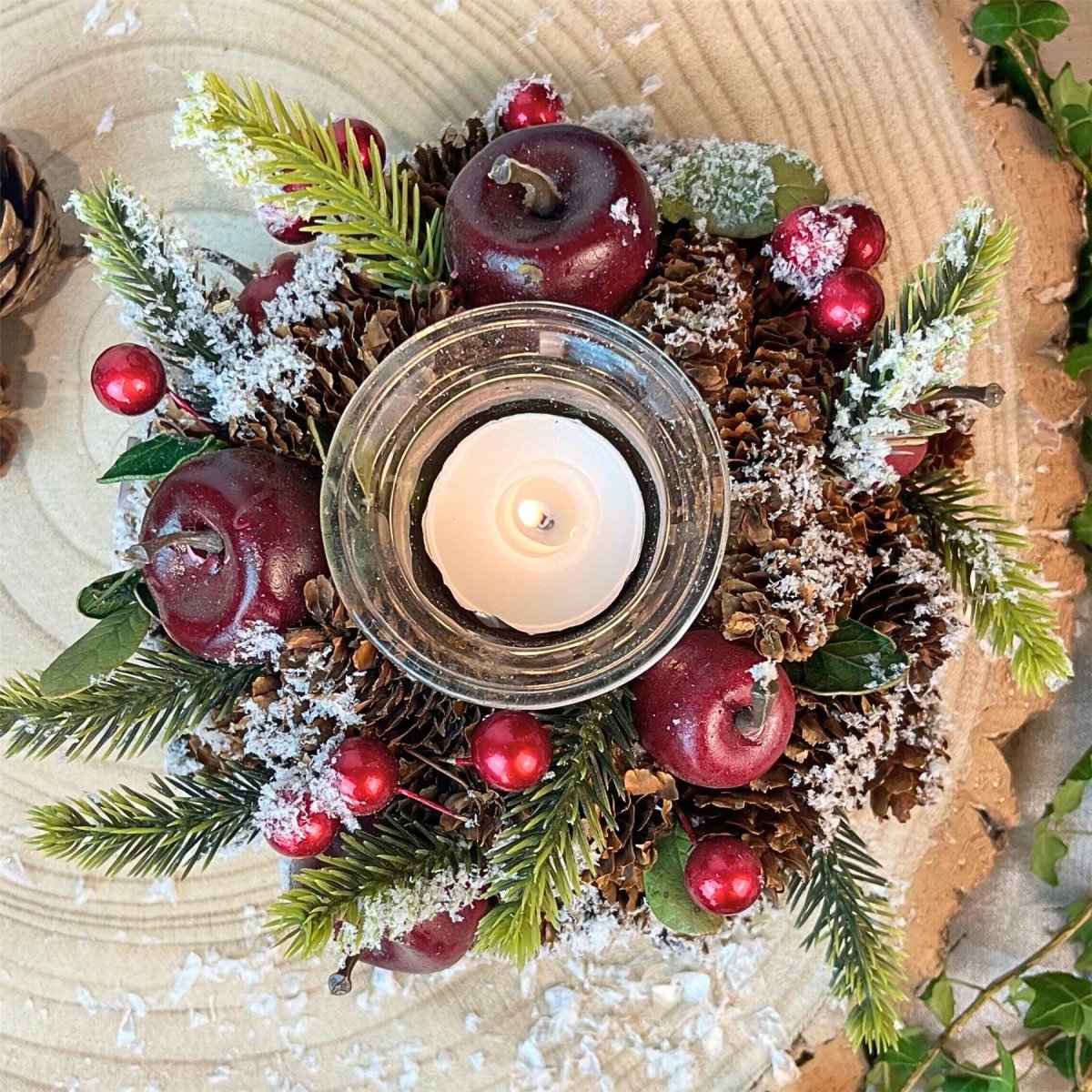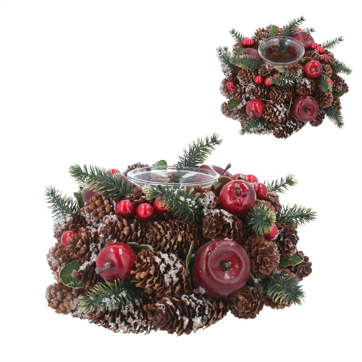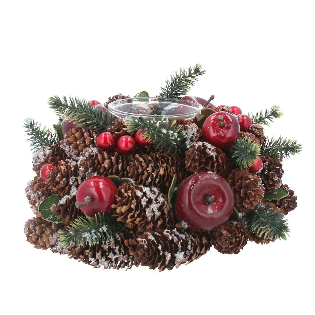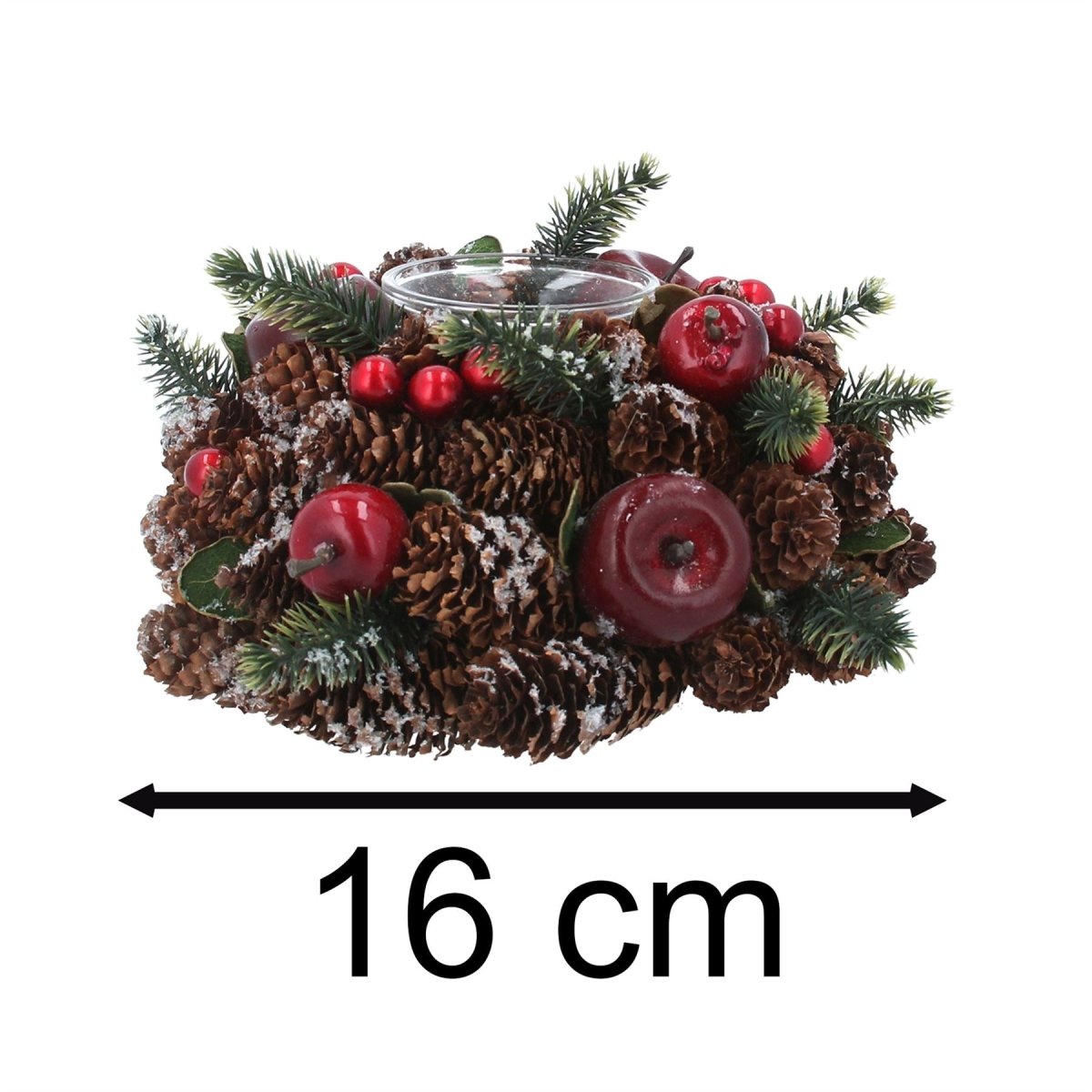 Bring holiday charm to your home with this tealight holder. Adorned with frosted pinecones, berries, and artificial fruit, it brings rustic charm to your Christmas table or mantelpiece. The warm flicker of candlelight combined with classic seasonal decor makes it the perfect centrepiece for Christmas gatherings or a thoughtful holiday gift. Measuring 16cm, it's compact yet impactful, ideal for adding that festive glow to any room