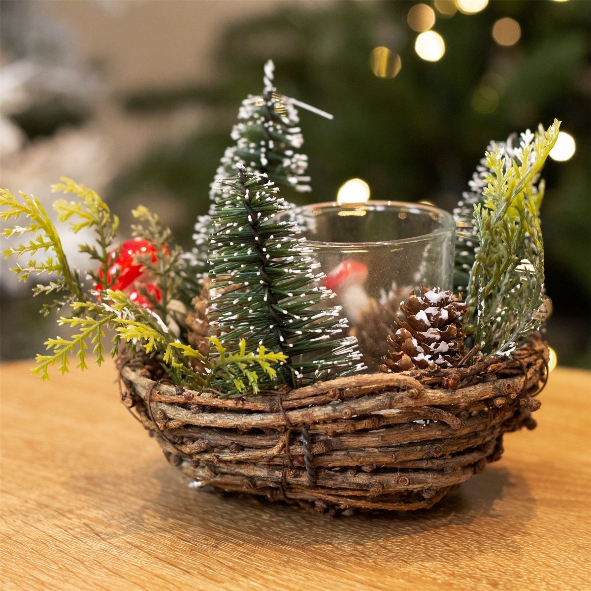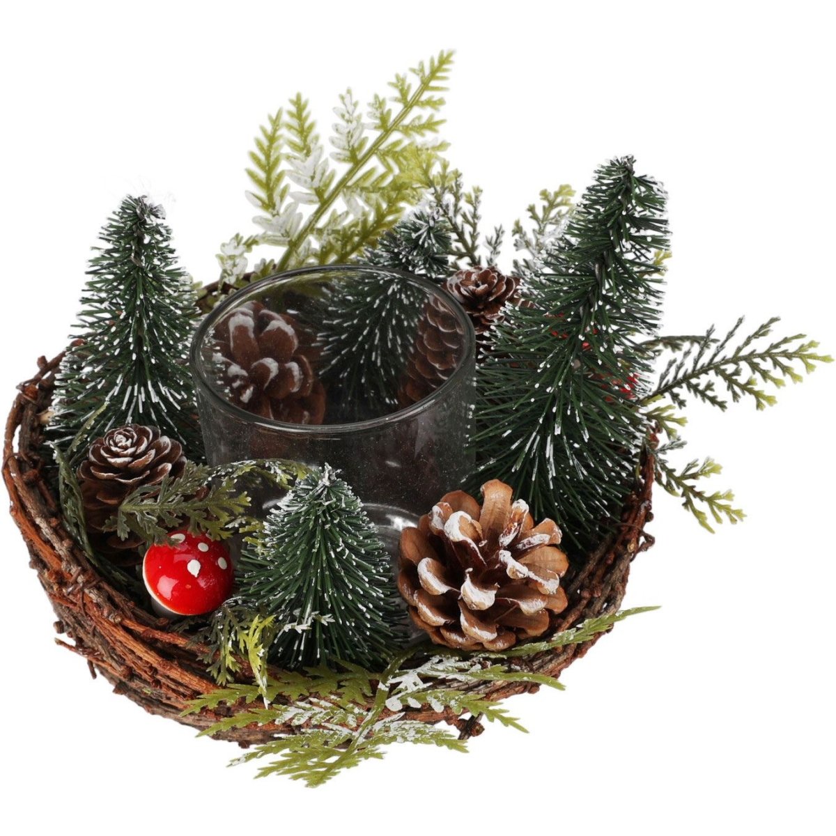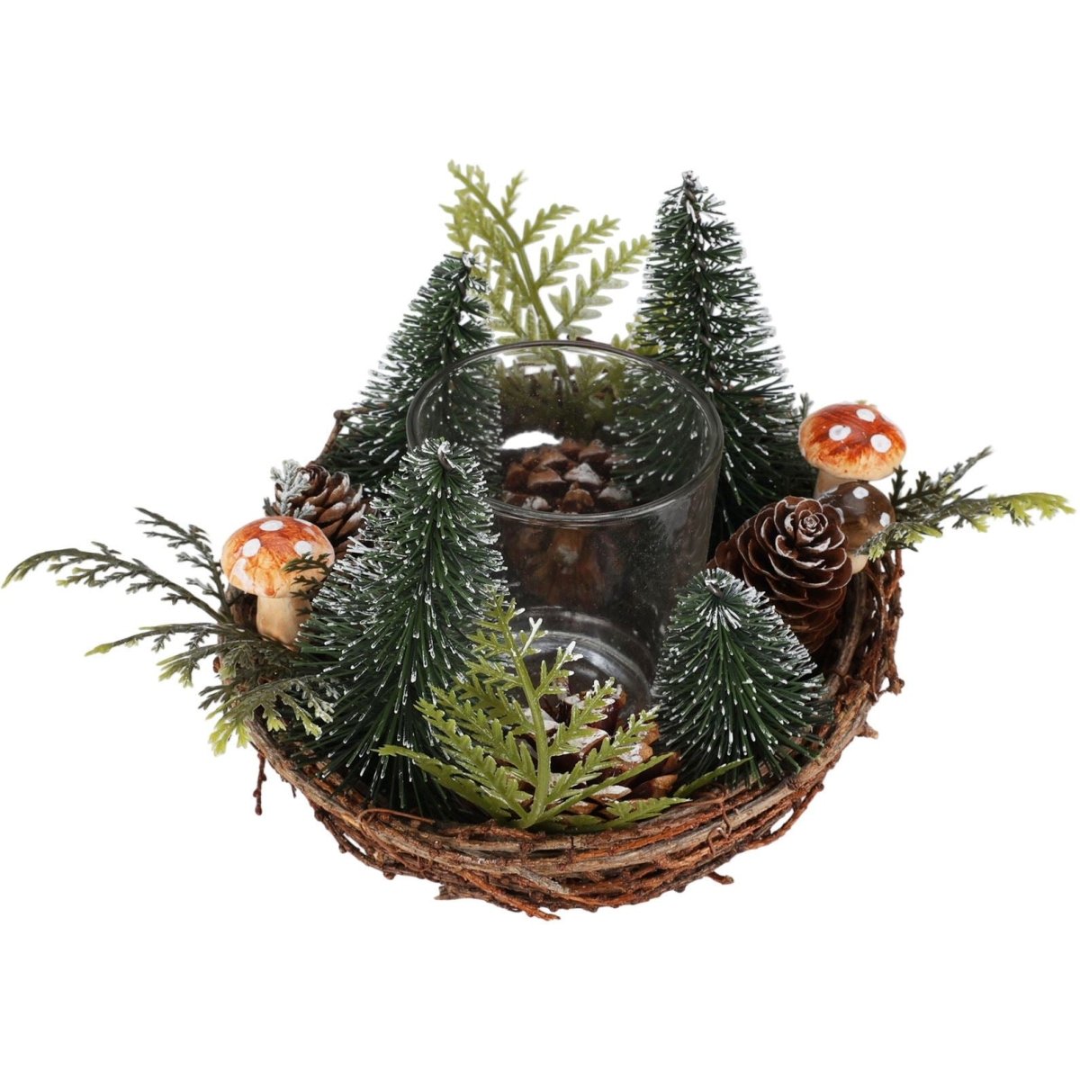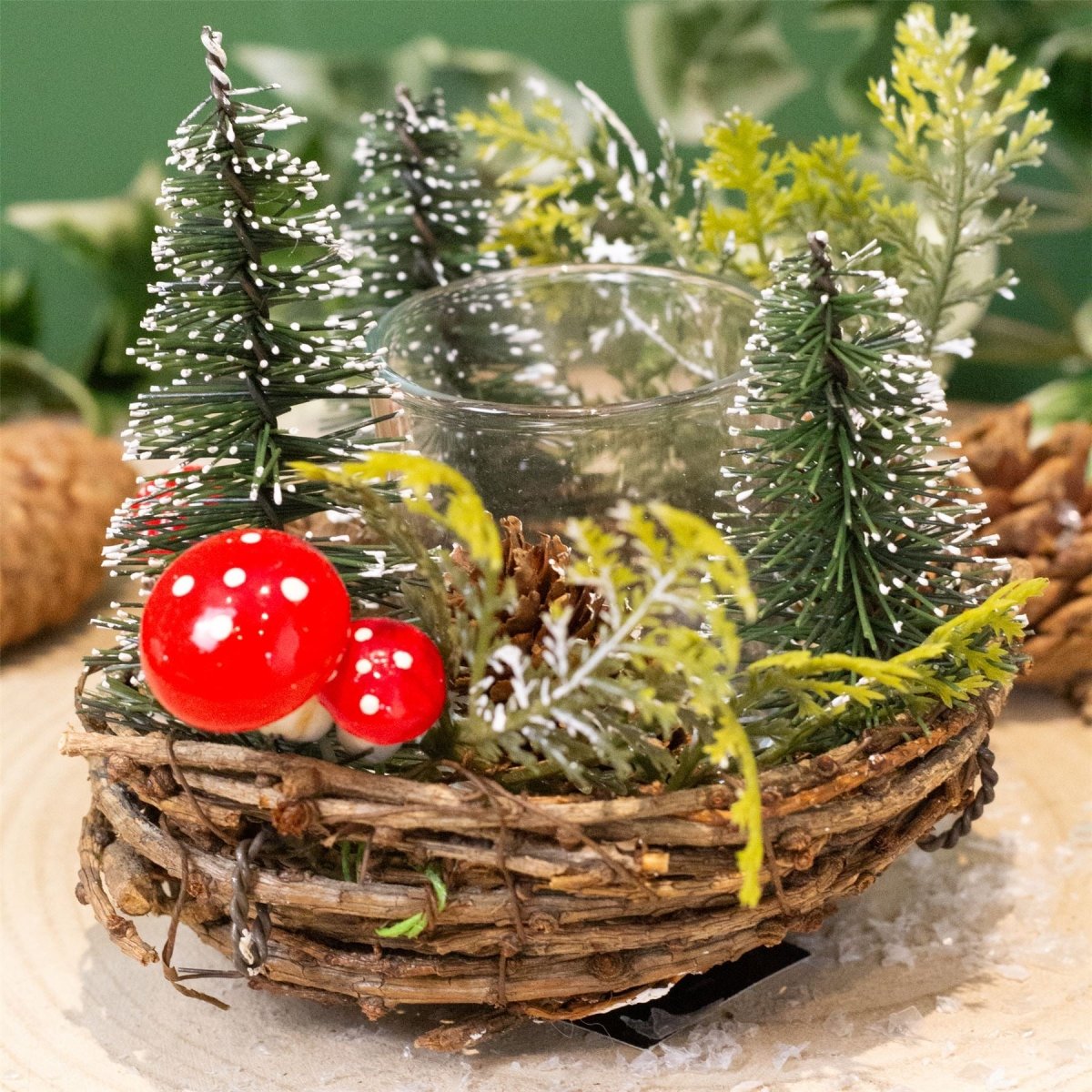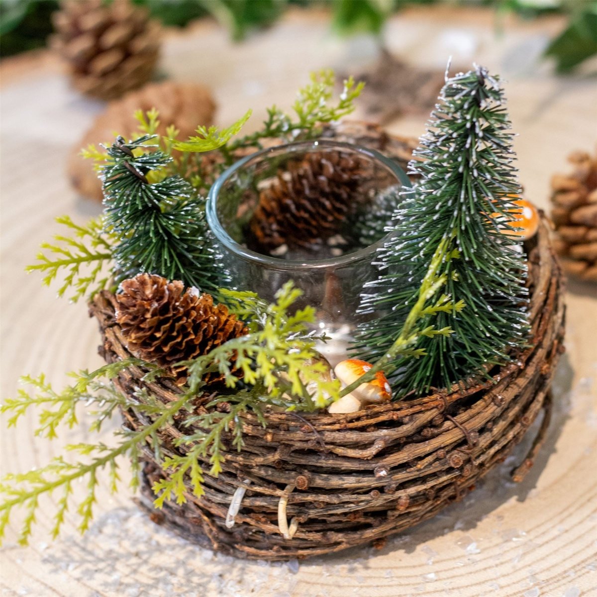 CHRISTMAS TEALIGHT HOLDER | Our traditional tealight holder adds festive charm to your decor. Featuring pine cones, bottle brush trees, and mini toadstools, it creates a cosy glow!
