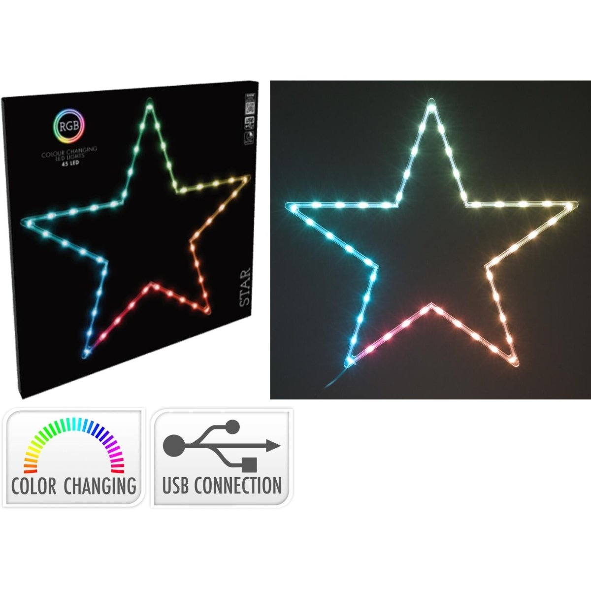 MULTI-COLOURED LED LIGHTS | With 45 RGB LEDs, this Christmas star light brings colour-changing charm to your space. Simply switch lighting modes with the button on the USB cable.