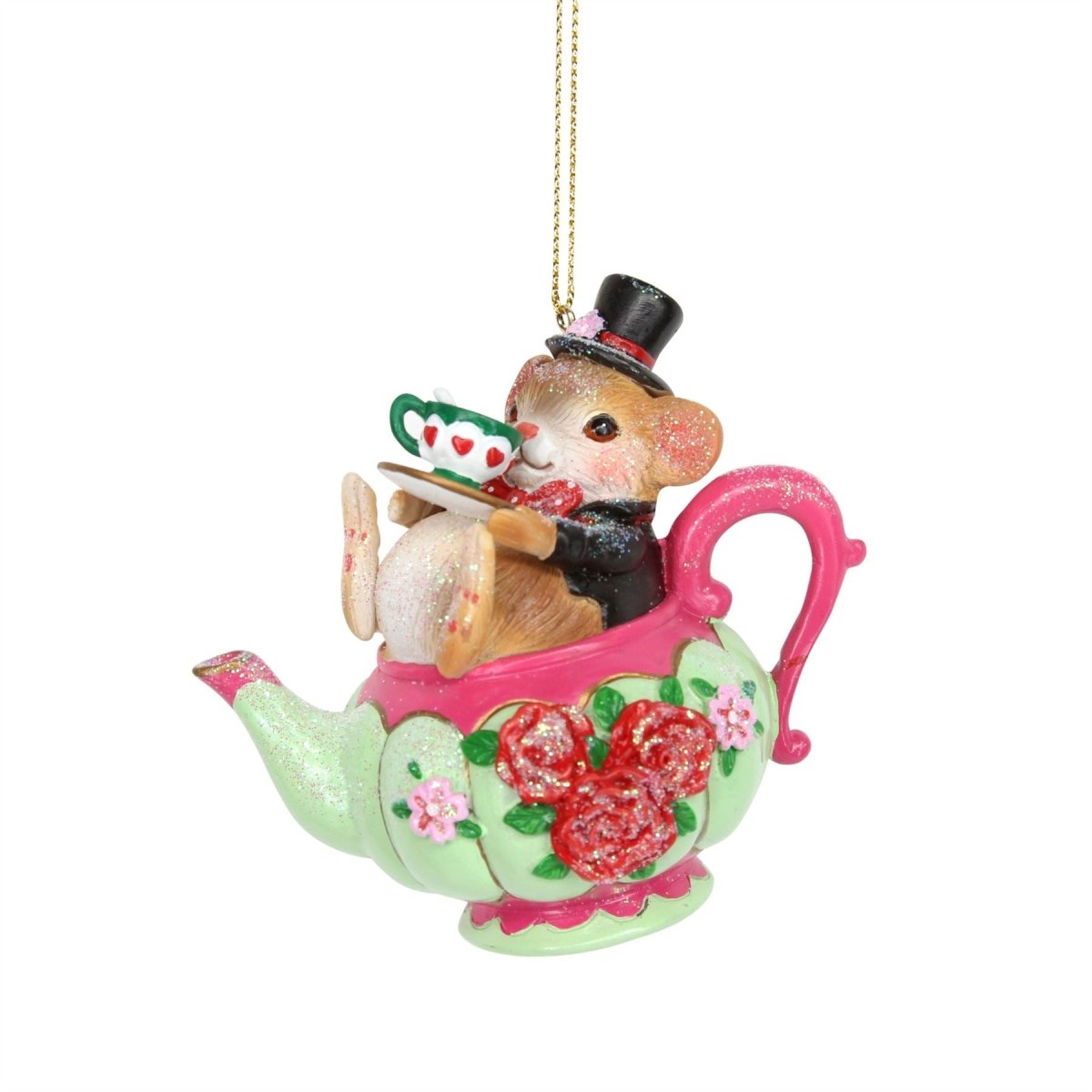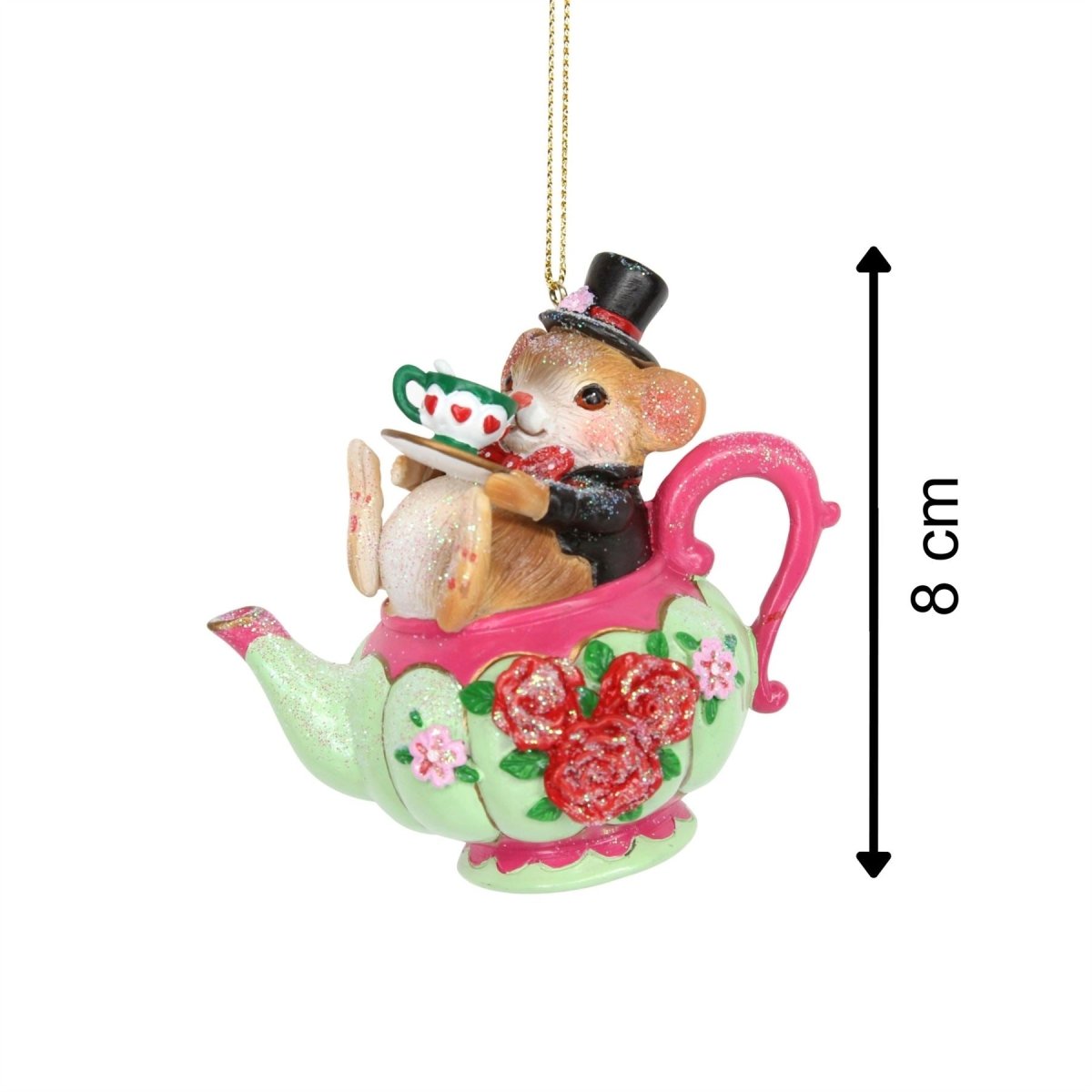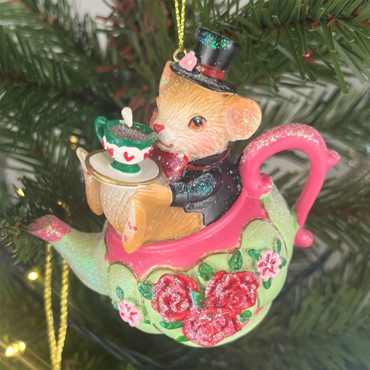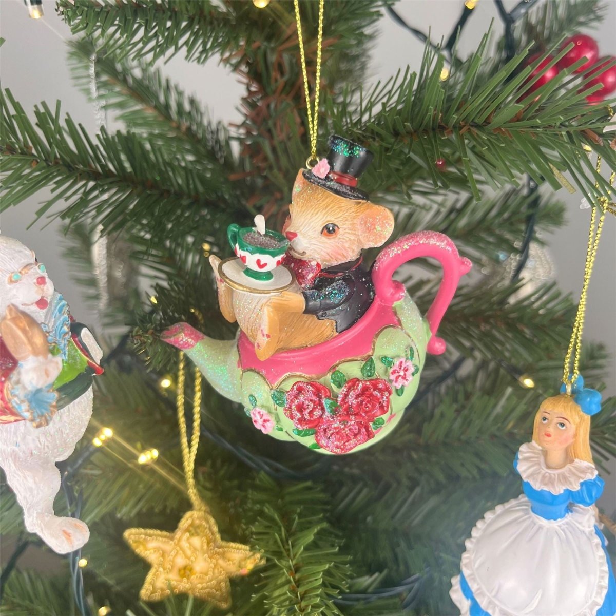 CHRISTMAS BAUBLE | This adorable Dormouse bauble form Gisela Graham captures the playful spirit of Lewis Carroll’s Alice in Wonderland, featuring the charming character nestled inside a flowery teapot with a matching teacup