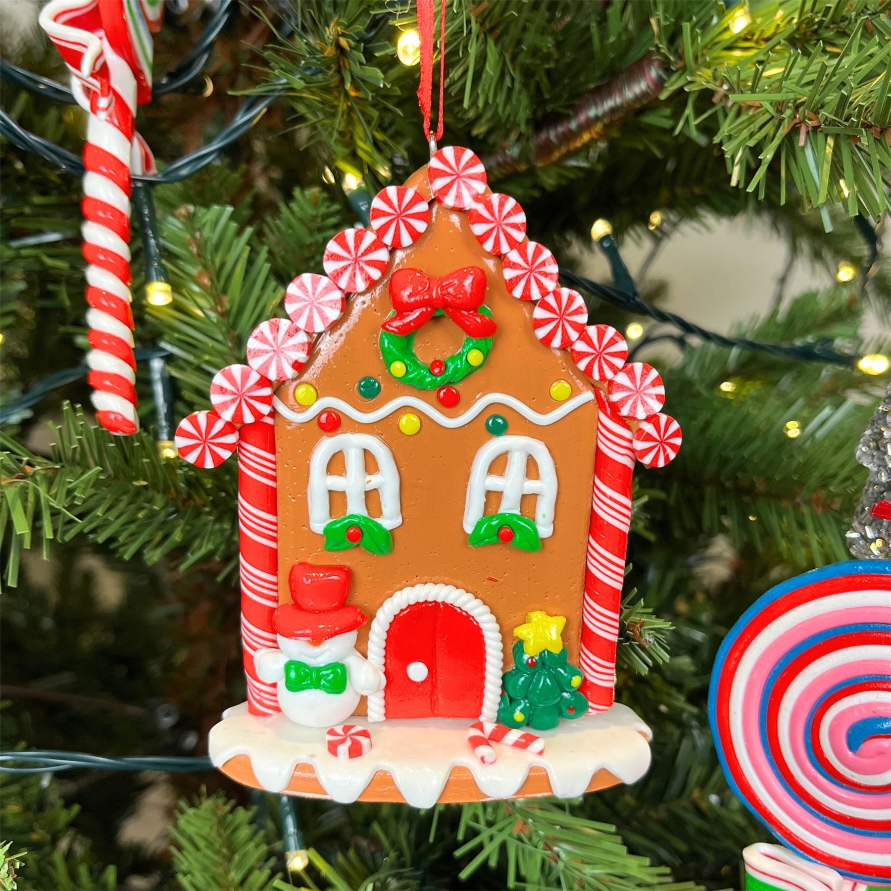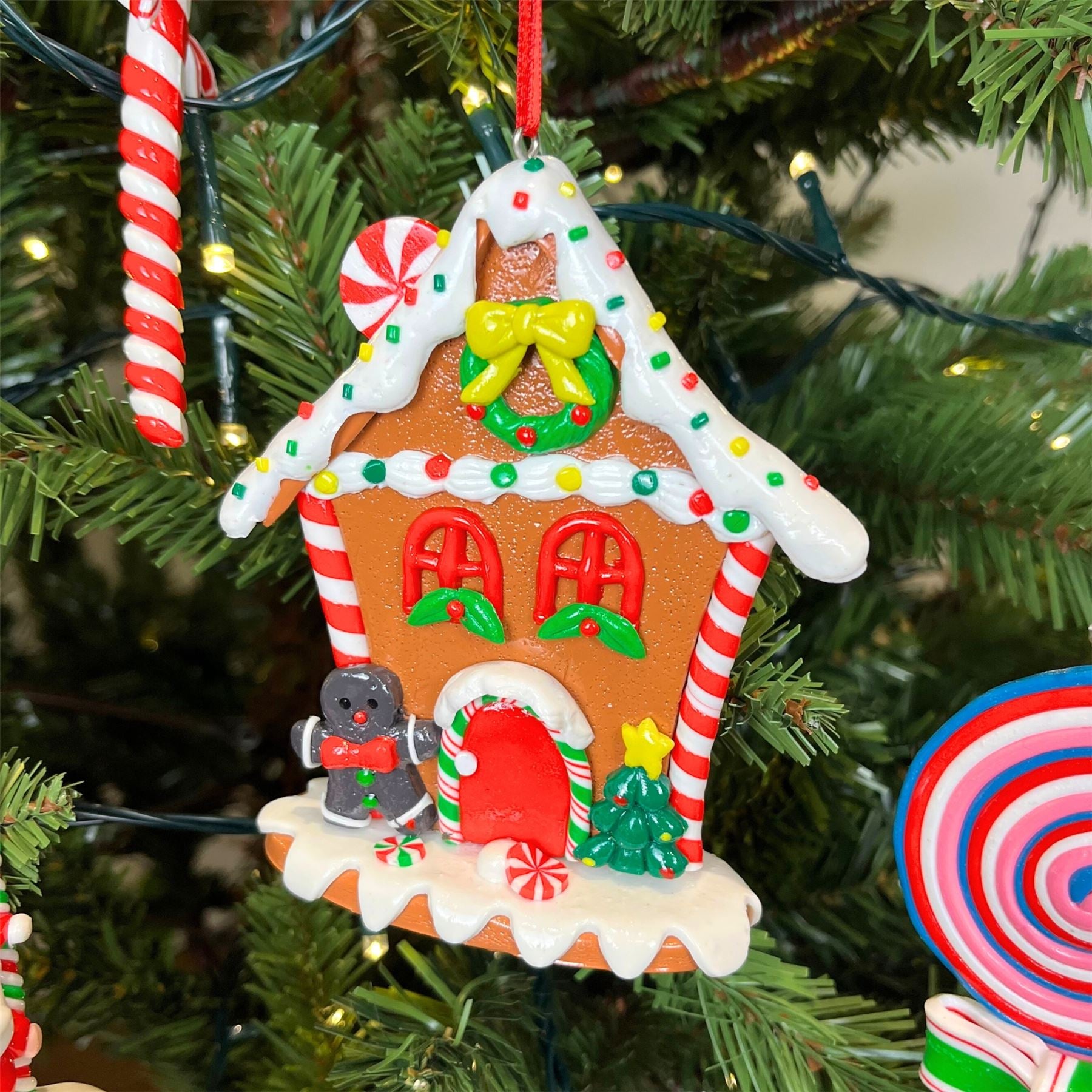 GINGERBREAD BAUBLE | These Gingerbread House baubles are crafted to resemble tiny gingerbread houses, complete with sweet candy details like candy canes, peppermints, and gumdrops