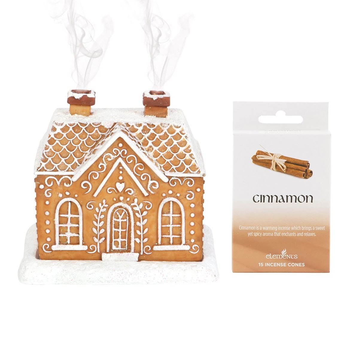 FESTIVE INCENSE BURNER SET | An adorable gingerbread house incense holder topped with snow, complete with 15 cinnamon cones for an instant seasonal fragrance