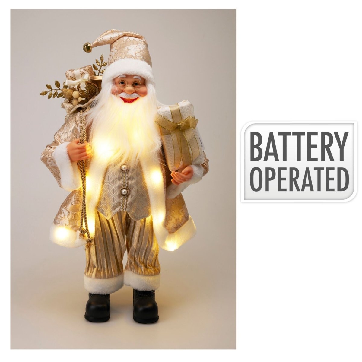 This 60cm gold Santa brings a warm festive glow with soft LED lighting, rich fabrics and classic details, making it a charming Christmas centrepiece for any room
