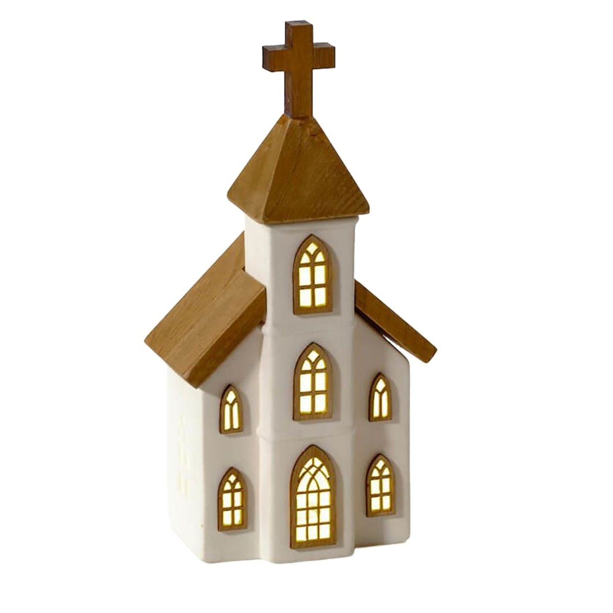 LED CHURCH | Made from smooth white ceramic with rustic brown wood touches on the roof and cross, blending elegance with tradition