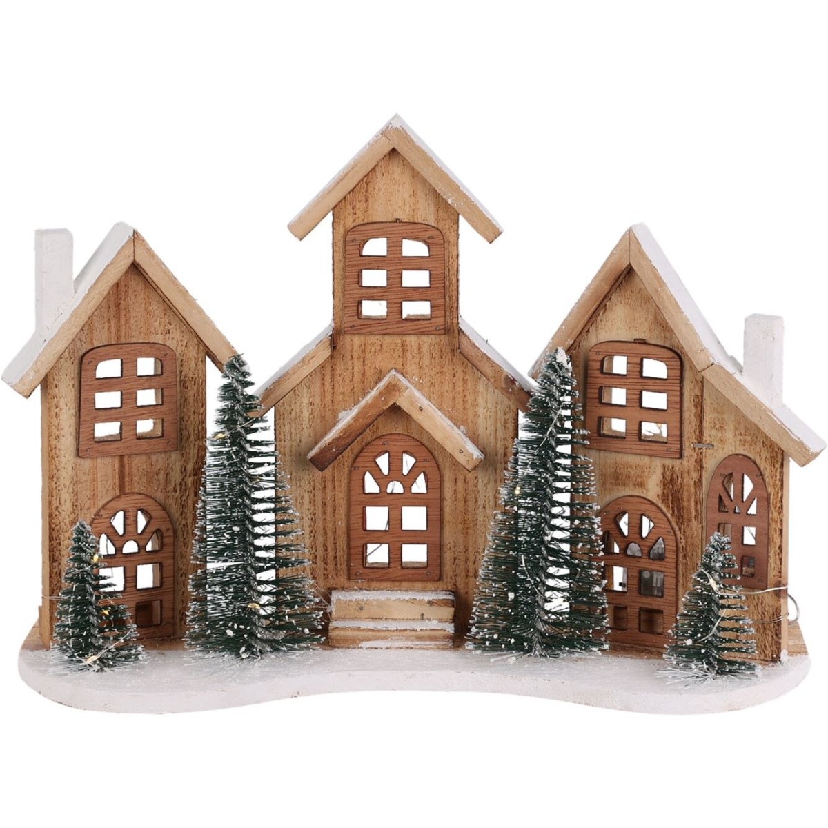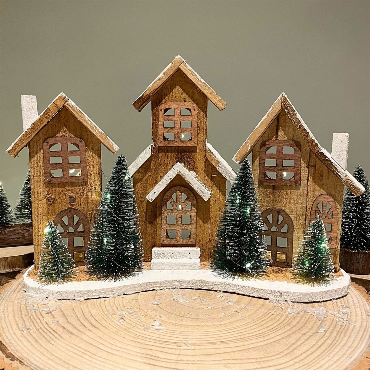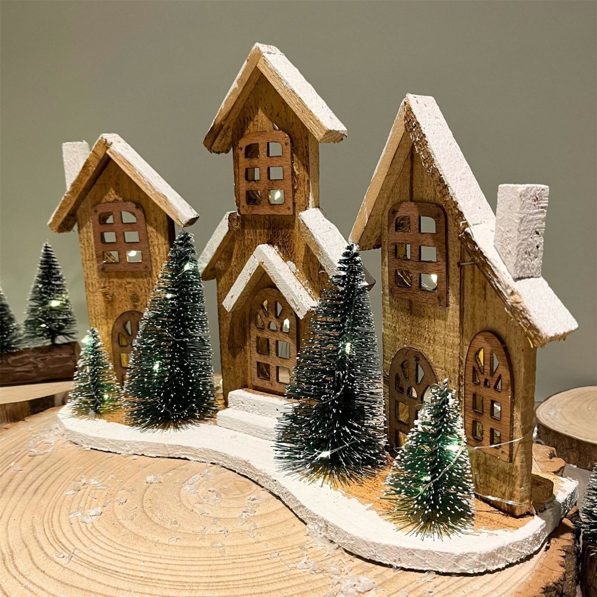 LED WOODEN HOUSE | Create a cosy festive atmosphere with this rustic wooden village, featuring three beautifully crafted houses dusted with snowy details for a warm, nostalgic vibe