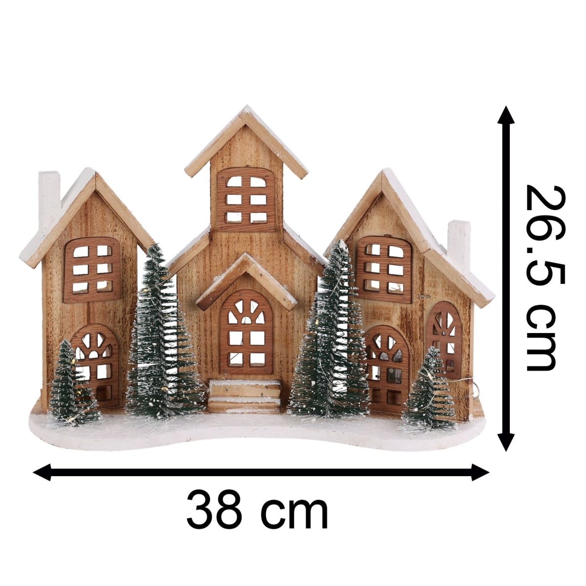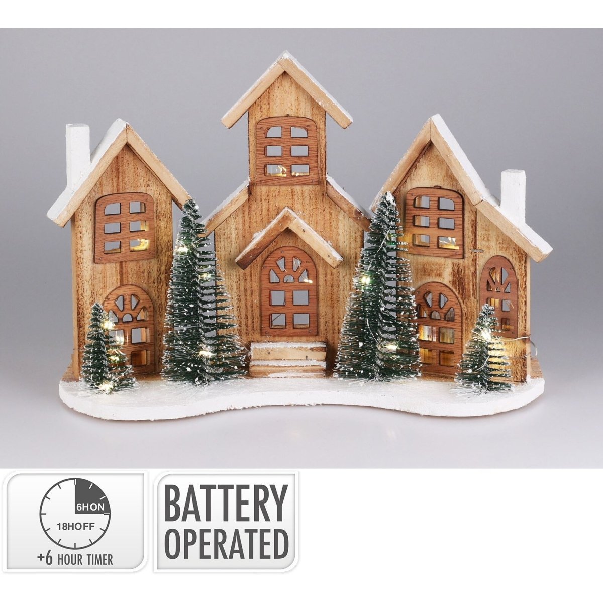 DIMENSIONS | Measuring 38x27cm, this delightful Christmas village ornament is powered by 2 x AA batteries (not included), with a convenient ON/OFF switch and a 6-hour timer for effortless use