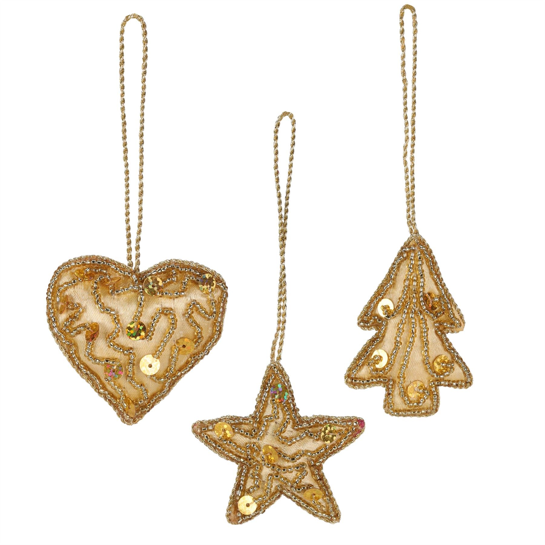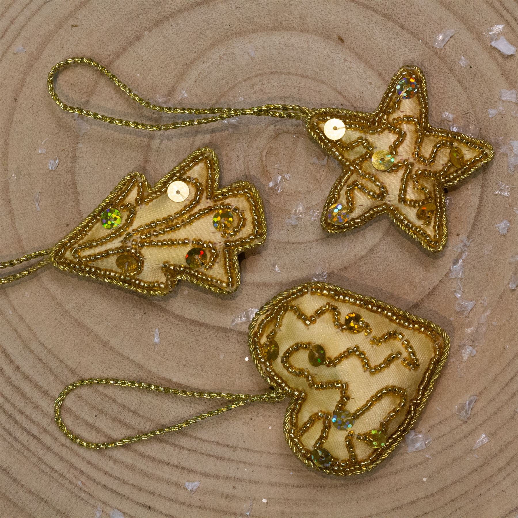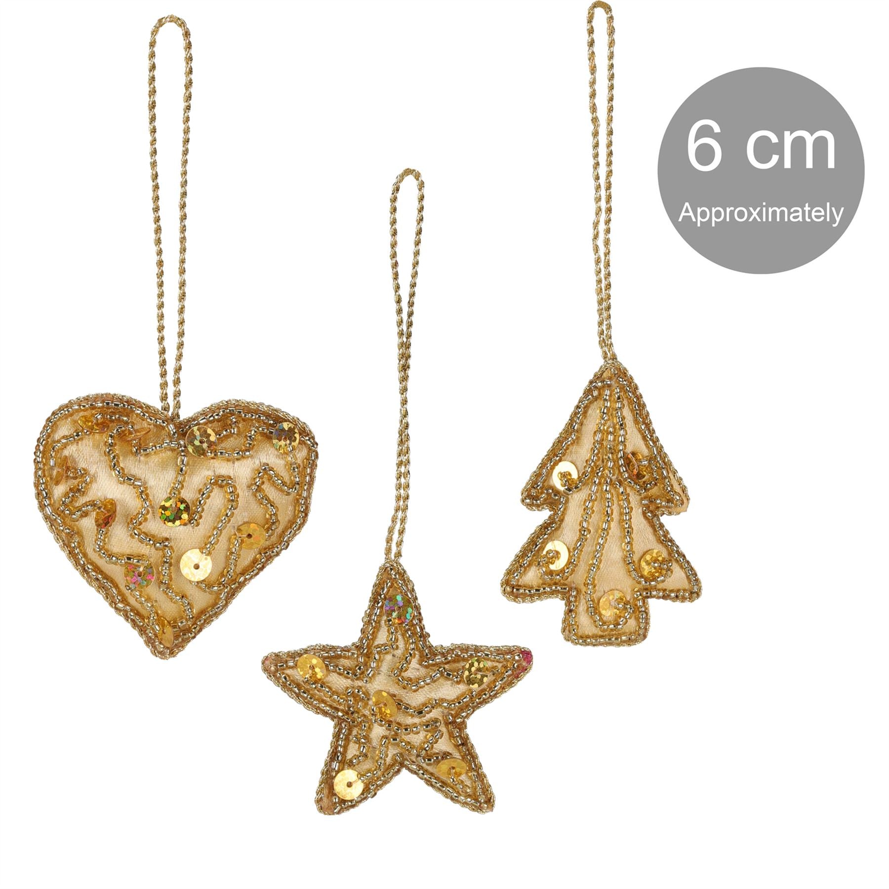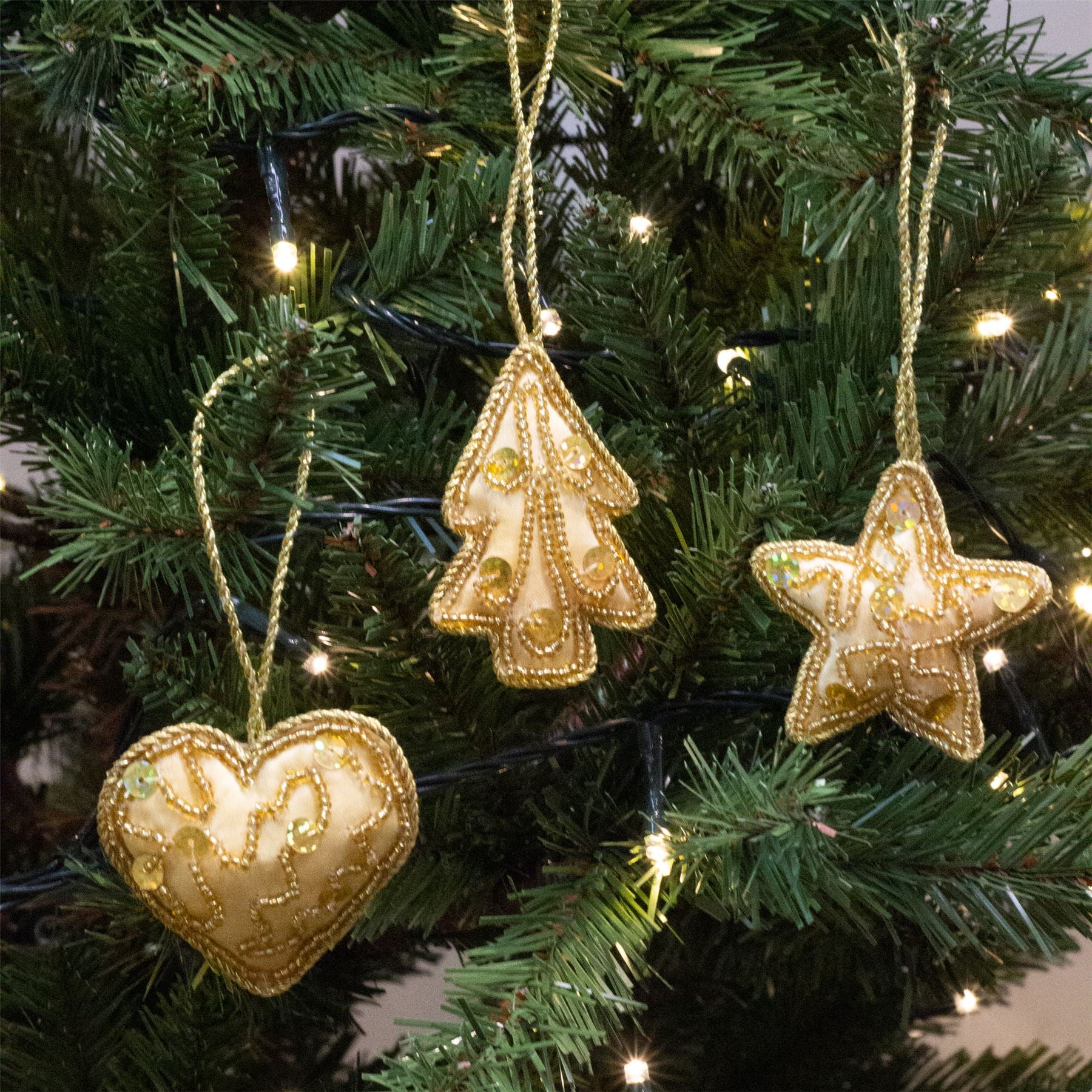 Our Christmas tree ornaments offer a stylish touch to your festive decor. Featuring elegant tree, heart and star shapes finished in luxurious gold fabric they catch the light beautifully, making them perfect for any festive theme