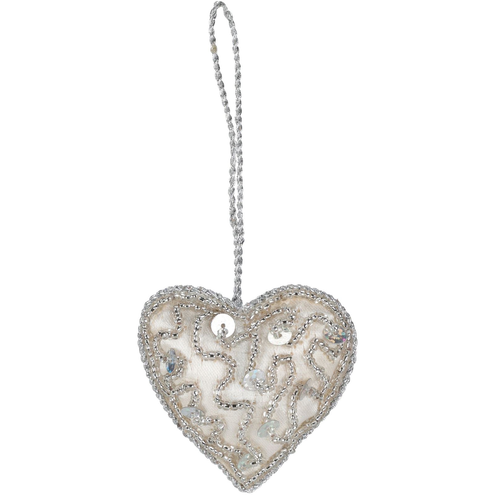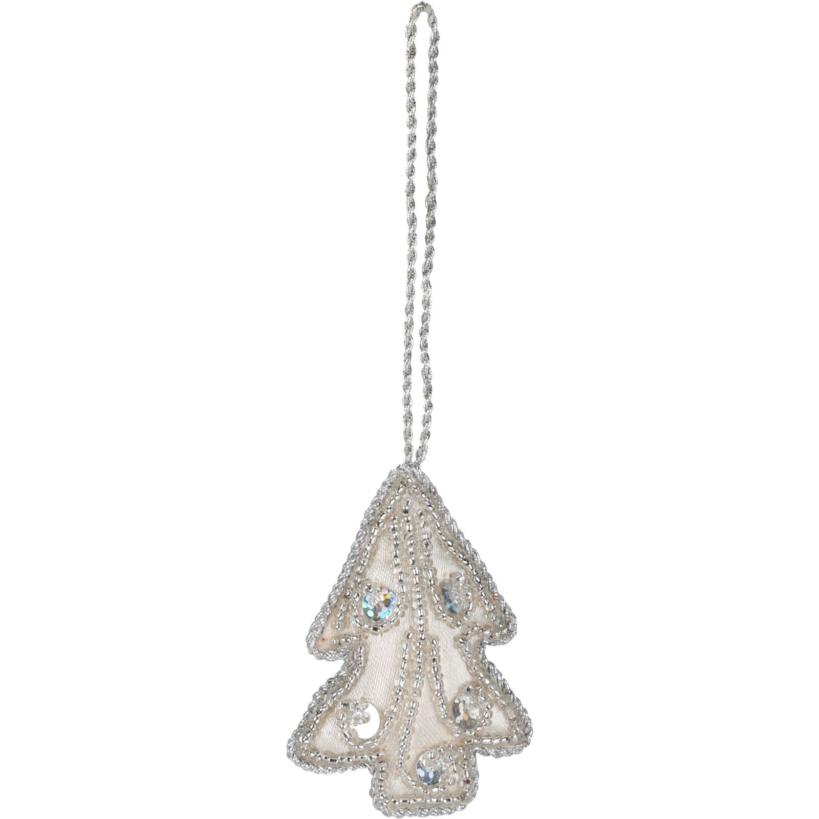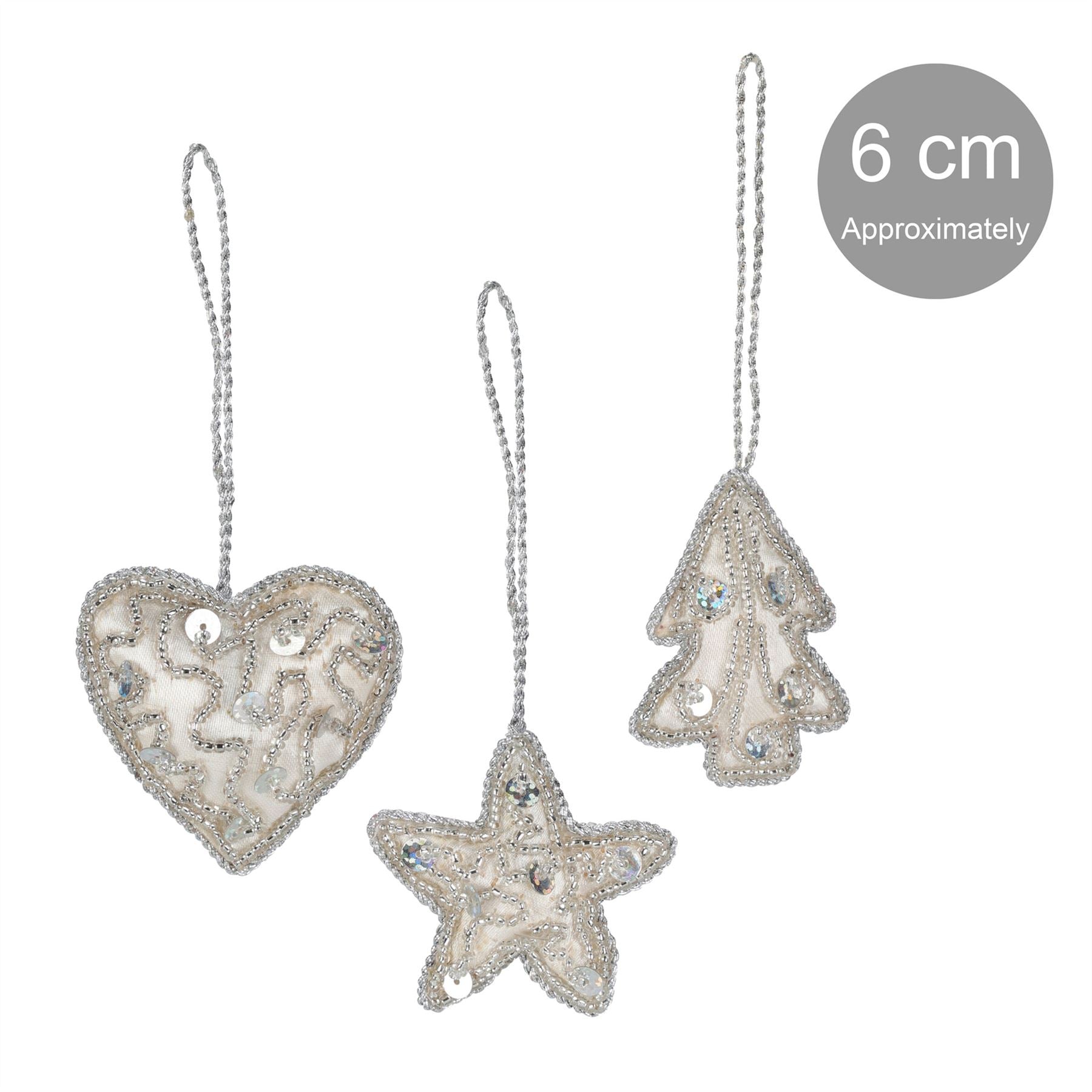 CHRISTMAS TREE ORNAMENTS | Add a touch of sophistication to your festive season with these elegant ivory ornaments. Featuring a delightful mix of tree, heart, and star shapes, each piece is adorned with sparkling silver sequins and beads for a stylish finishing touch