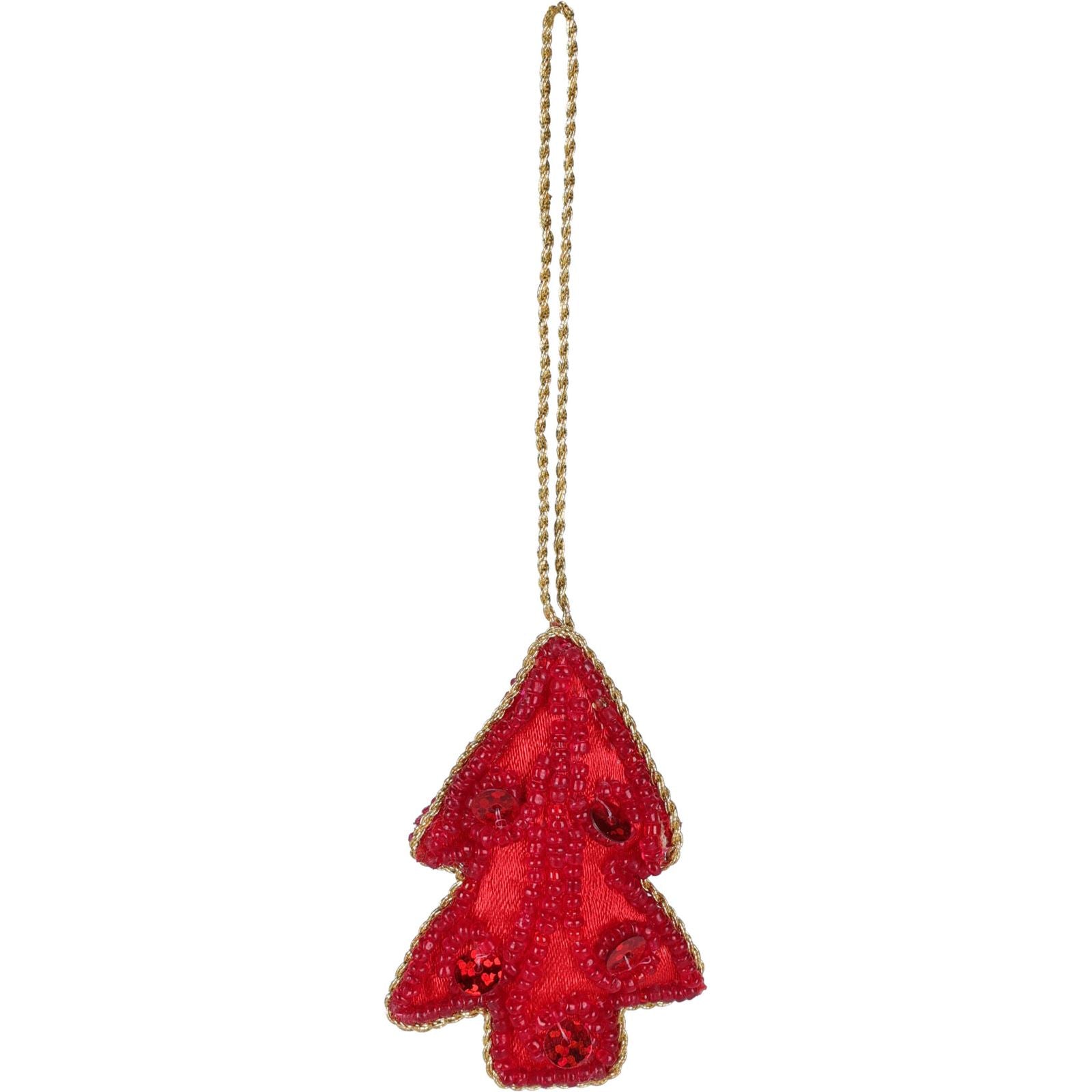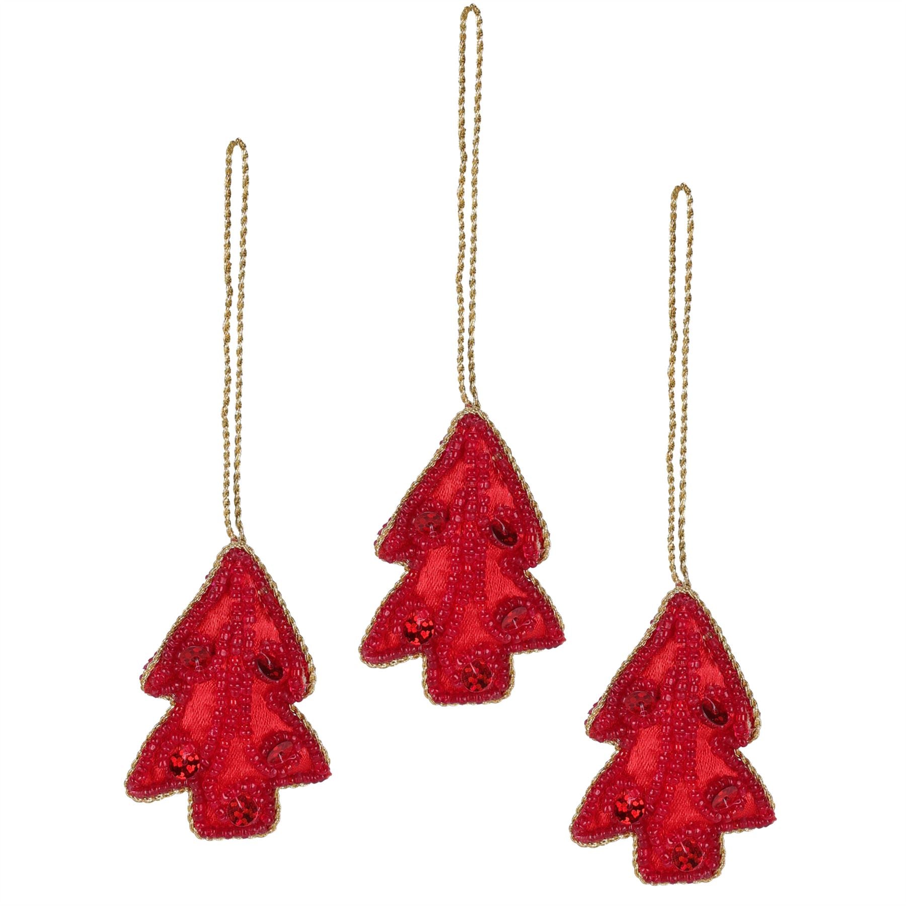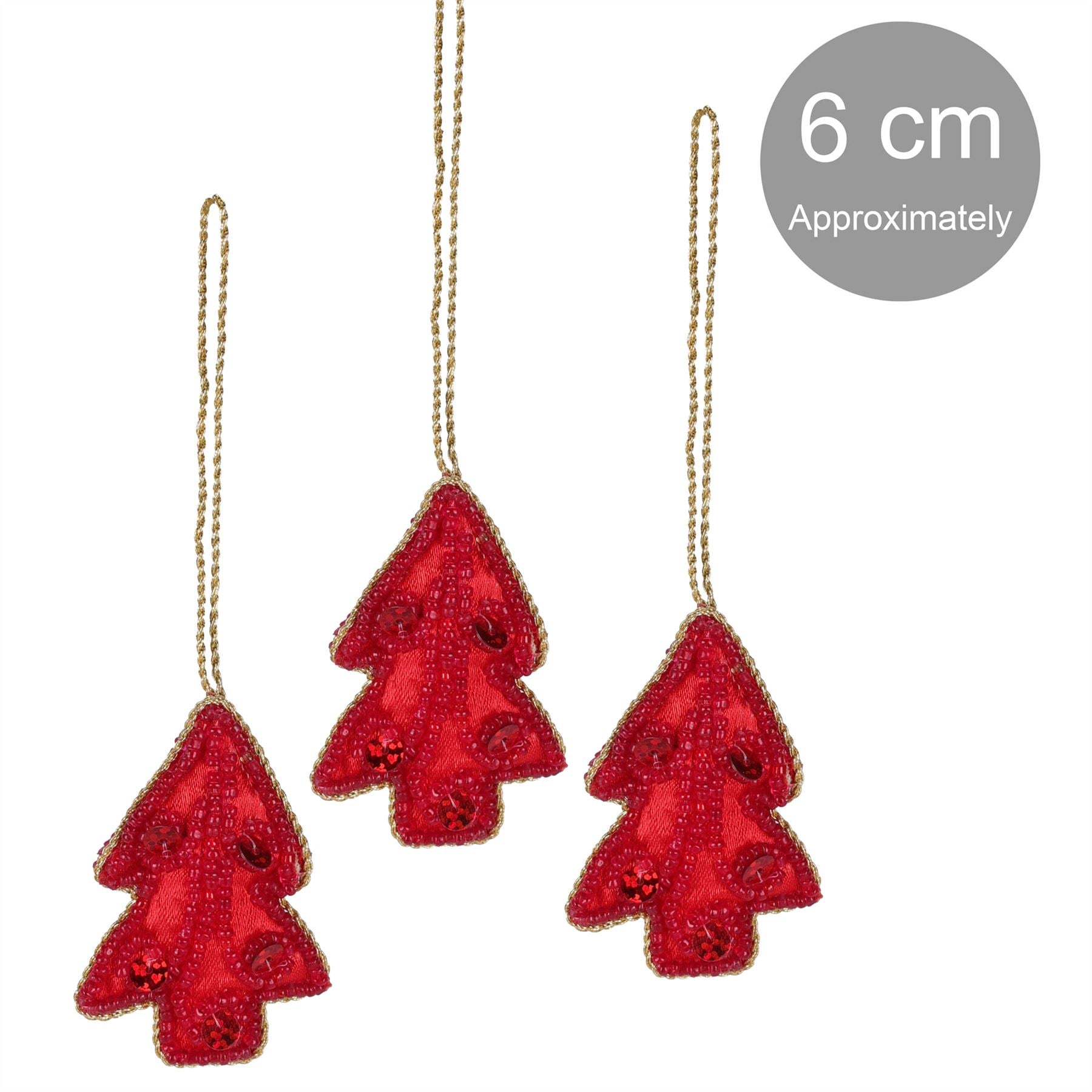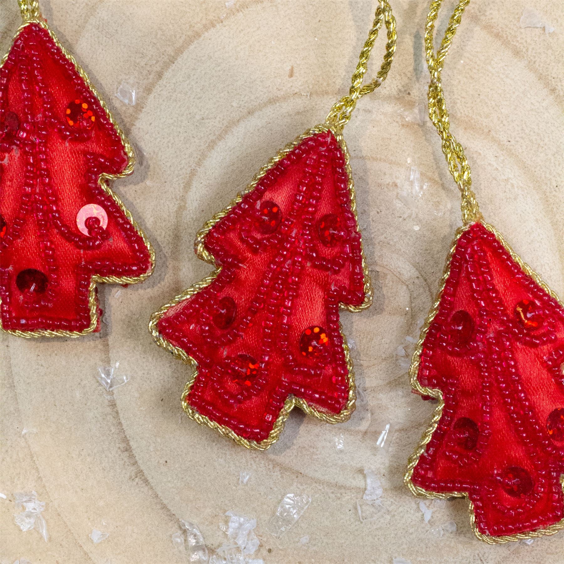 CHRISTMAS TREE ORNAMENTS | Brighten up your festive decor with these vibrant red tree-shaped ornaments. Each piece is elegantly covered in sparkling sequins and beads, adding a touch of festive cheer to your Christmas tree