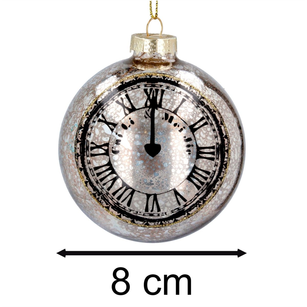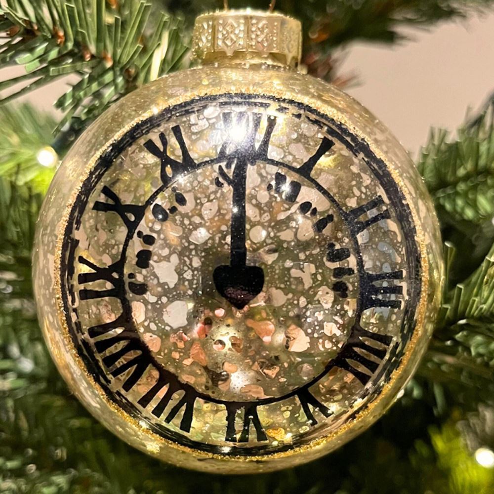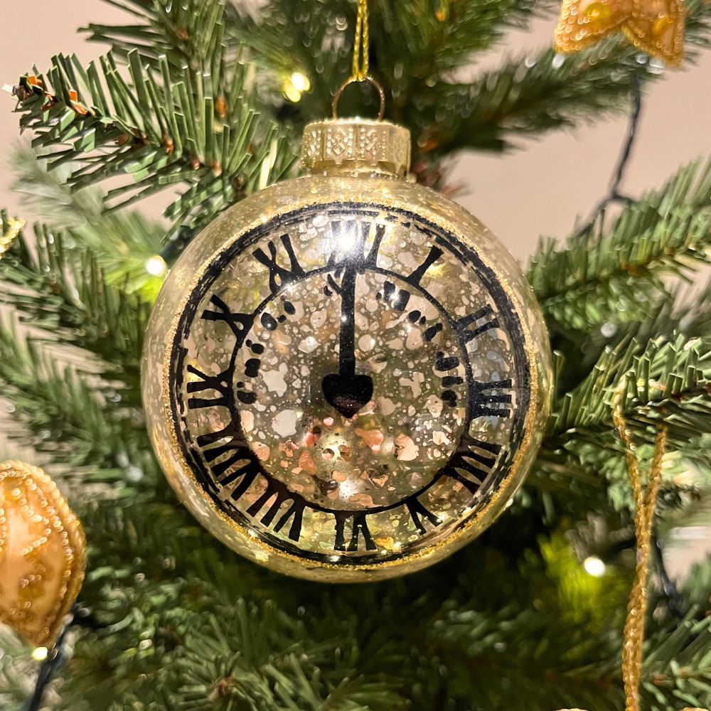 CHRISTMAS TREE ORNAMENT | Beautifully designed with a timeless clock face, framed in golden glitter, this bauble is handcrafted from premium glass, offering a delicate shimmer with its mottled silver finish