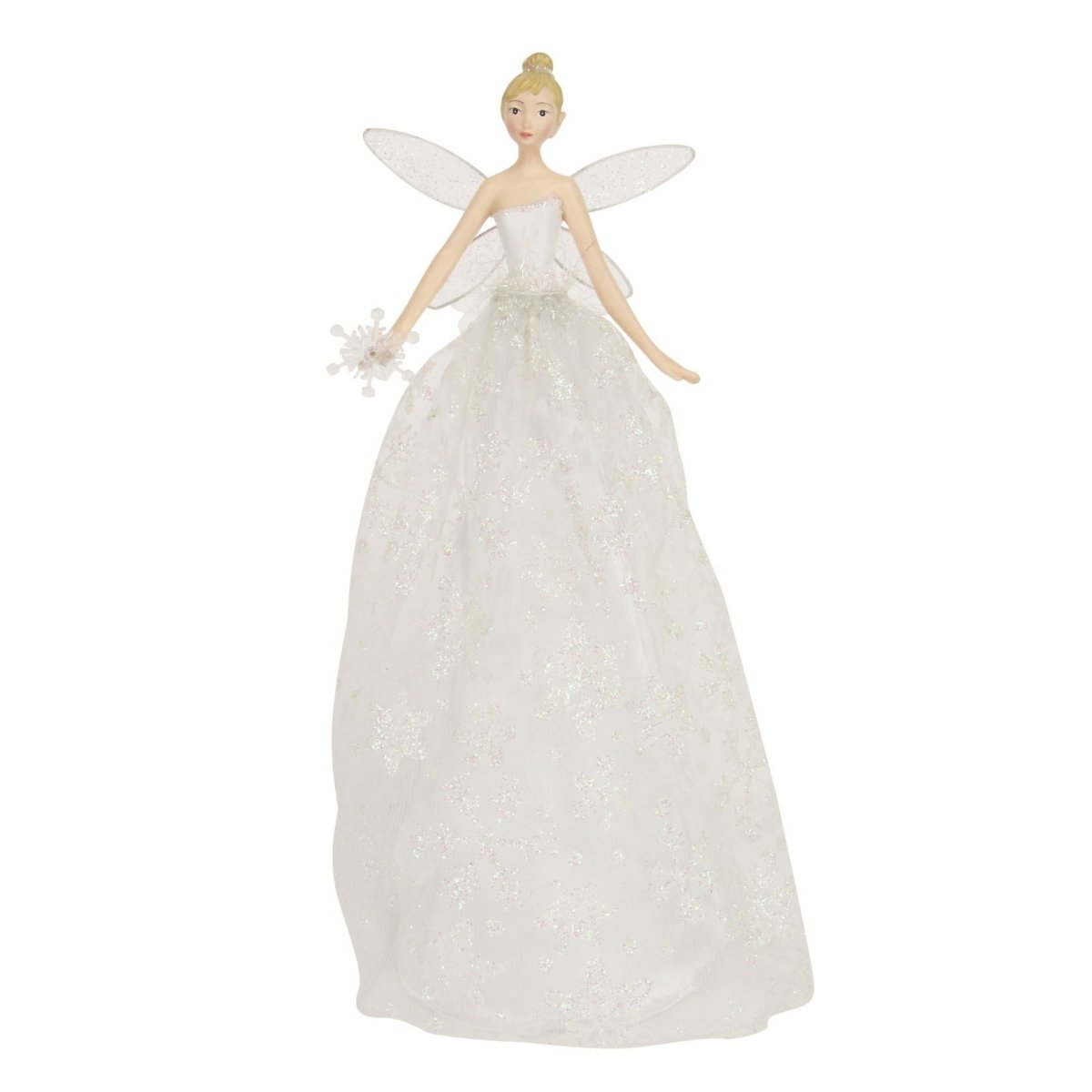 STUNNING DESIGN | This enchanting white angel tree topper, designed by Gisela Graham, features a sparkling iridescent dress, glittery wings, and delicate snowflake details, making it a perfect finishing touch for your tree
