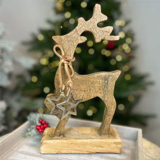 Rustic Wooden Reindeer Ornament | Christmas Deer Sculpture on Wooden Base - 26cm