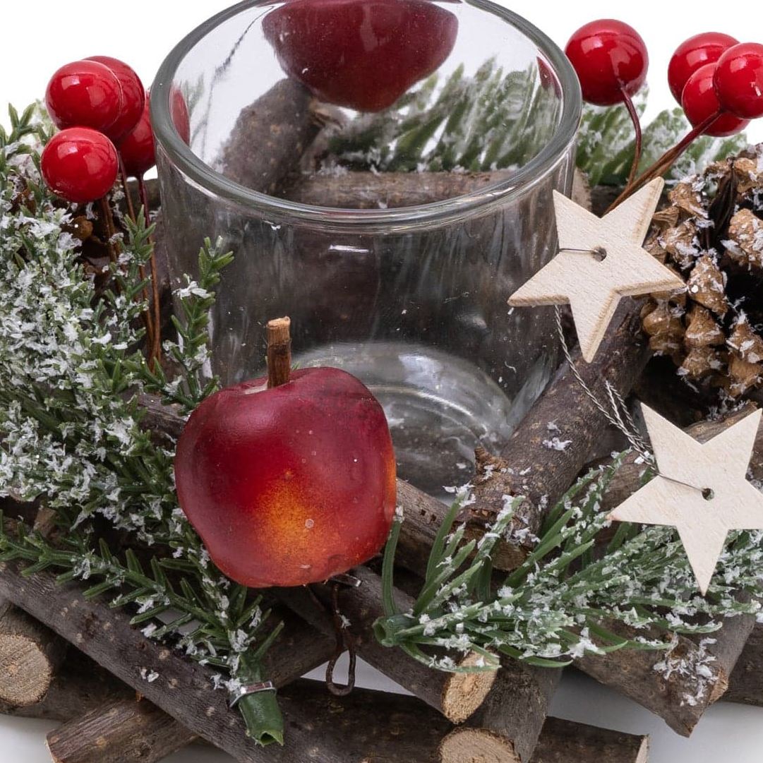 CHRISTMAS TEALIGHT HOLDER | Our traditional Christmas tealight holder is perfect for adding a touch of festive charm to your holiday decor. Featuring a selection of natural pine cones, delicate Christmas stars, and juicy red apples interspersed with artificial red berries. Light up the evening with the warm glow of a flickering tealight and relax in the cosy atmosphere of the festive season. Ideal for adding a touch of rustic charm to any room.