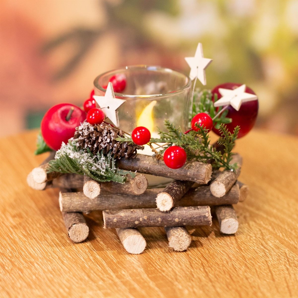 Beautifully rustic wooden tealight candle holder featuring a selection of woodland pinecones and little Christmas stars interspersed with lovely artificial red berries, fruit and pine greenery that will look wonderful at Christmas and make your home feel