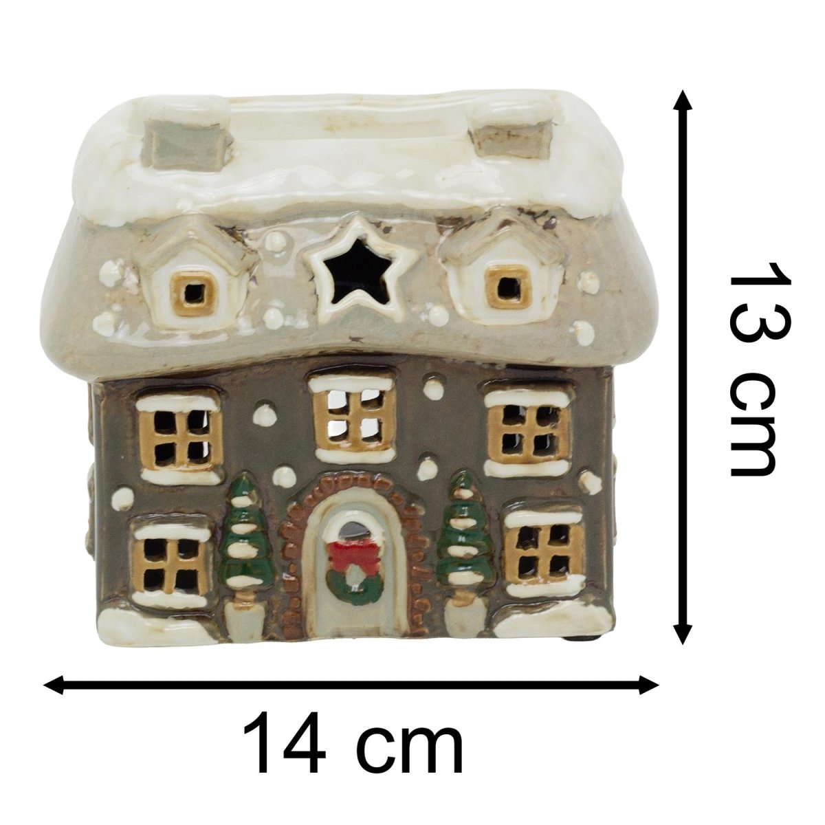 FESTIVE COTTAGE DESIGN | A beautifully embossed grey stoneware cottage with painted Christmas details, including snowy roof accents, two green trees and a bright red wreath for a homely winter feel