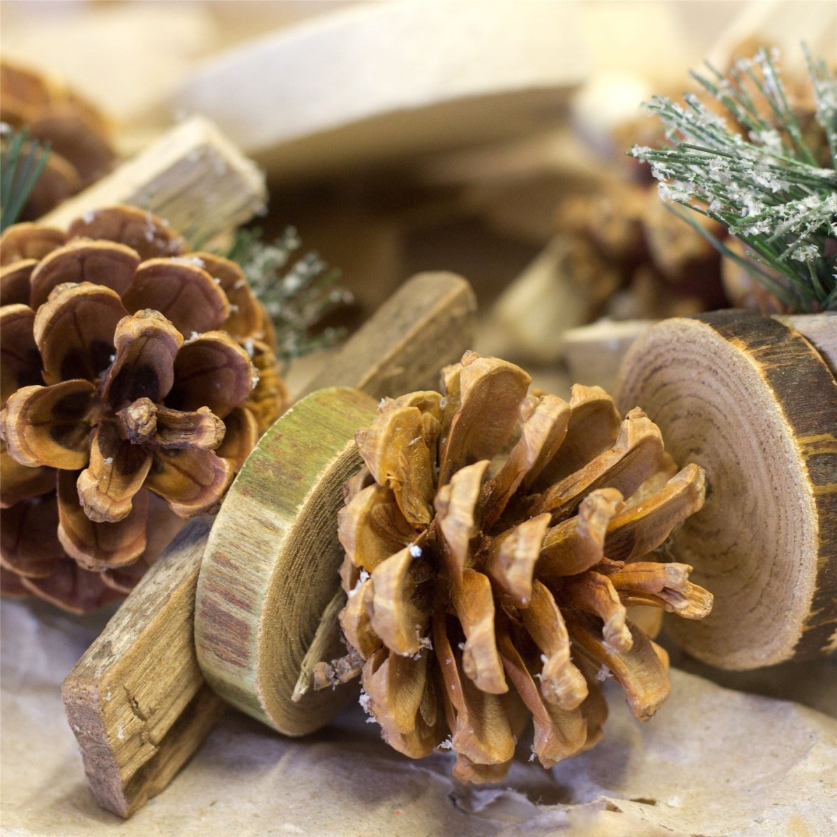 XMAS DECOR: Delightful natural pine cones are decorated with snow and interspersed with lovely artificial white berries, pine greenery and rustic twigs.