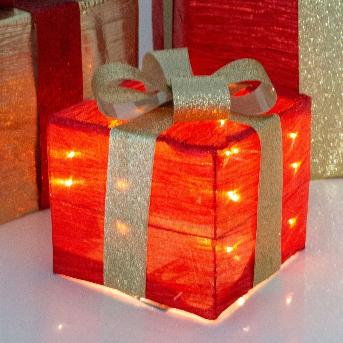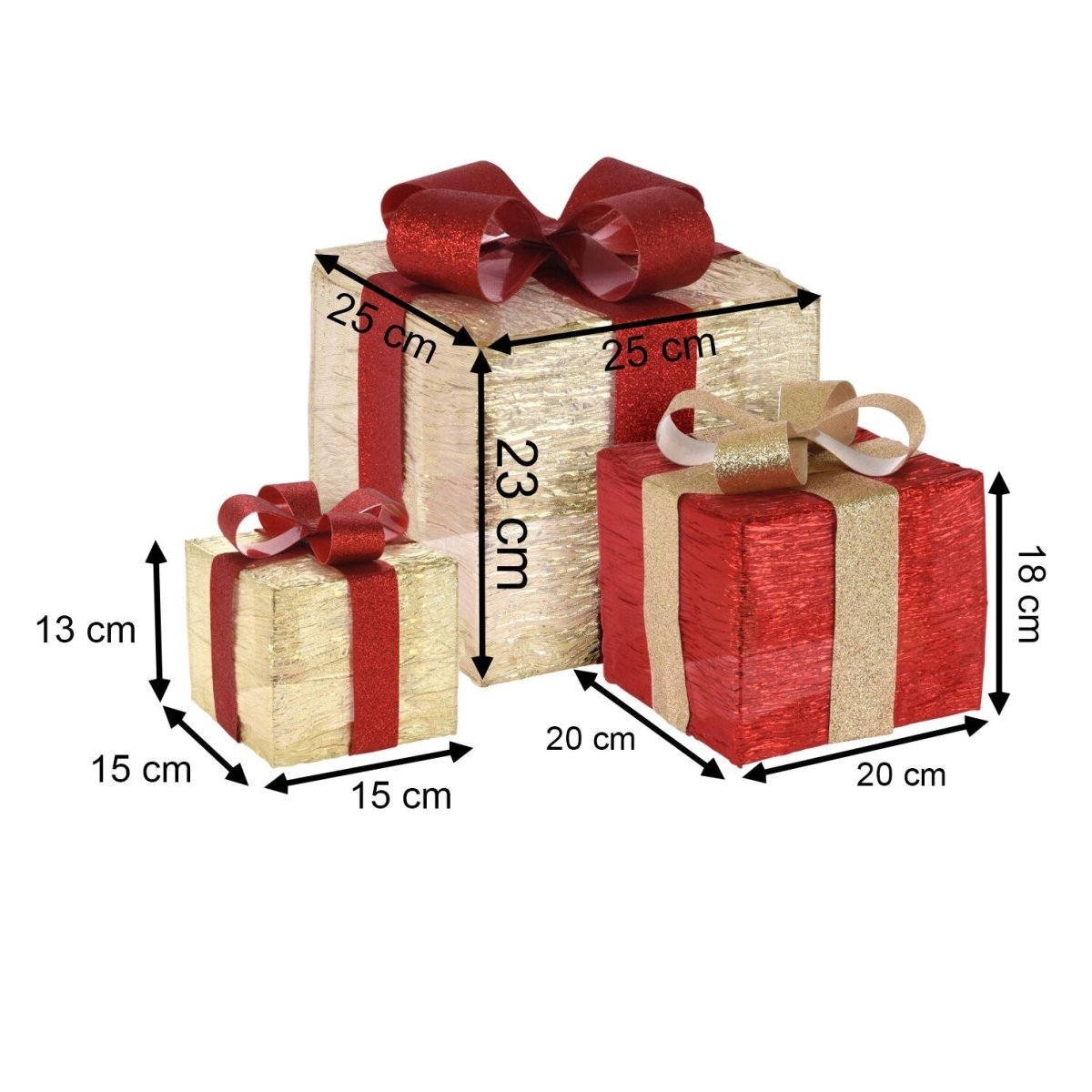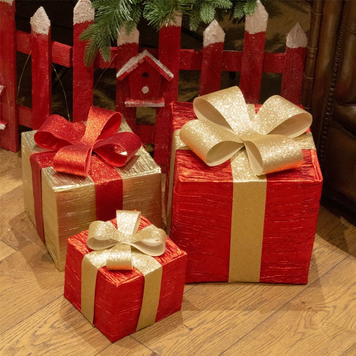 LED CHRISTMAS PRESENT BOXES | Simply gorgeous set of red & gold LED Christmas present boxes. The gifts boxes can be displayed individually, as each has its own battery housing, but they look absolutely stunning when clustered together. Wonderful to create a Christmas arrangement in your home