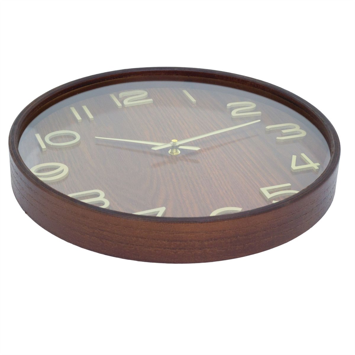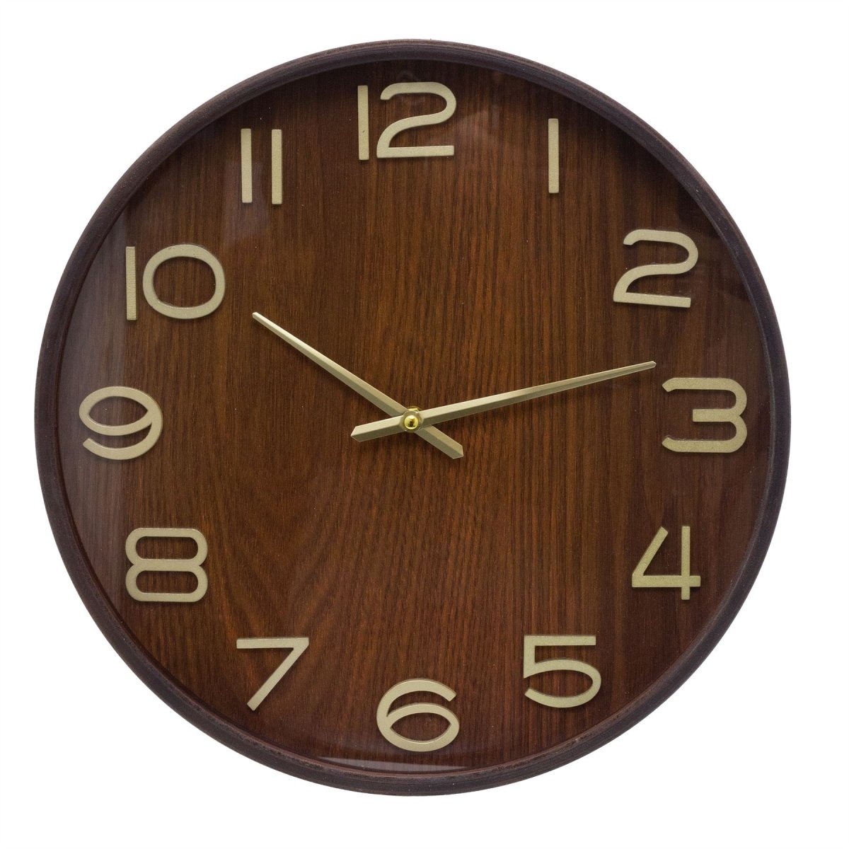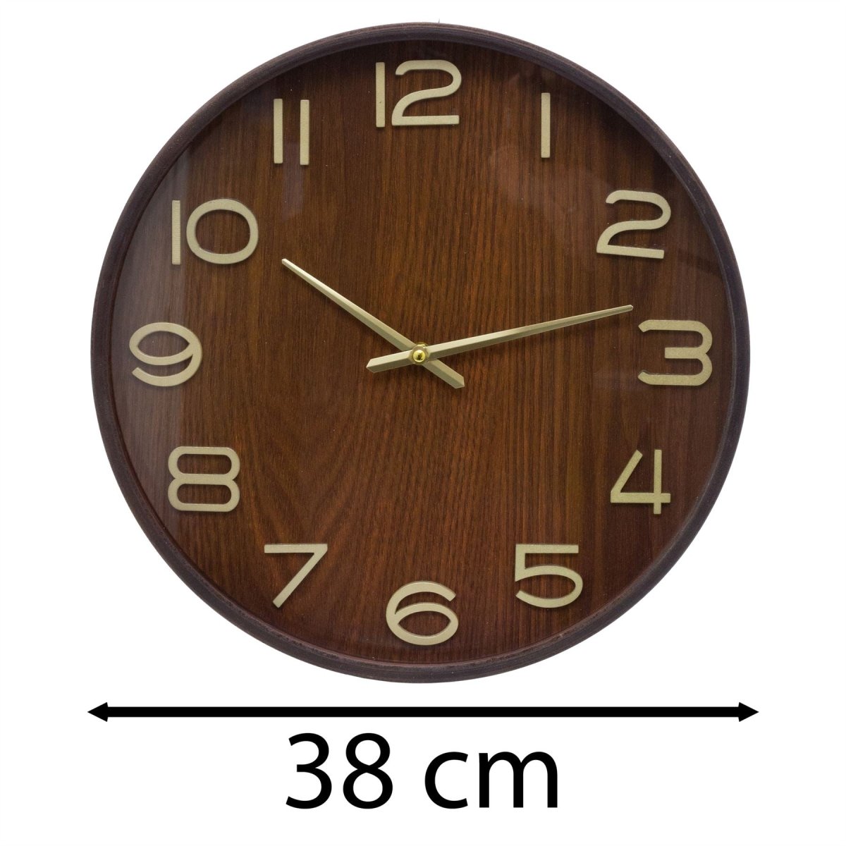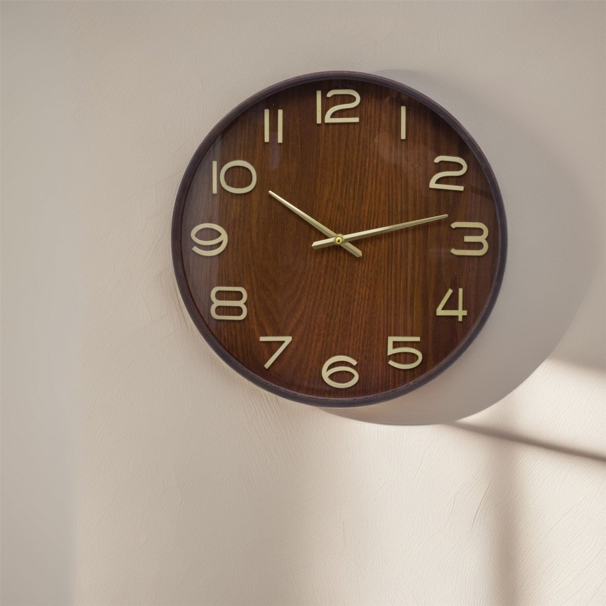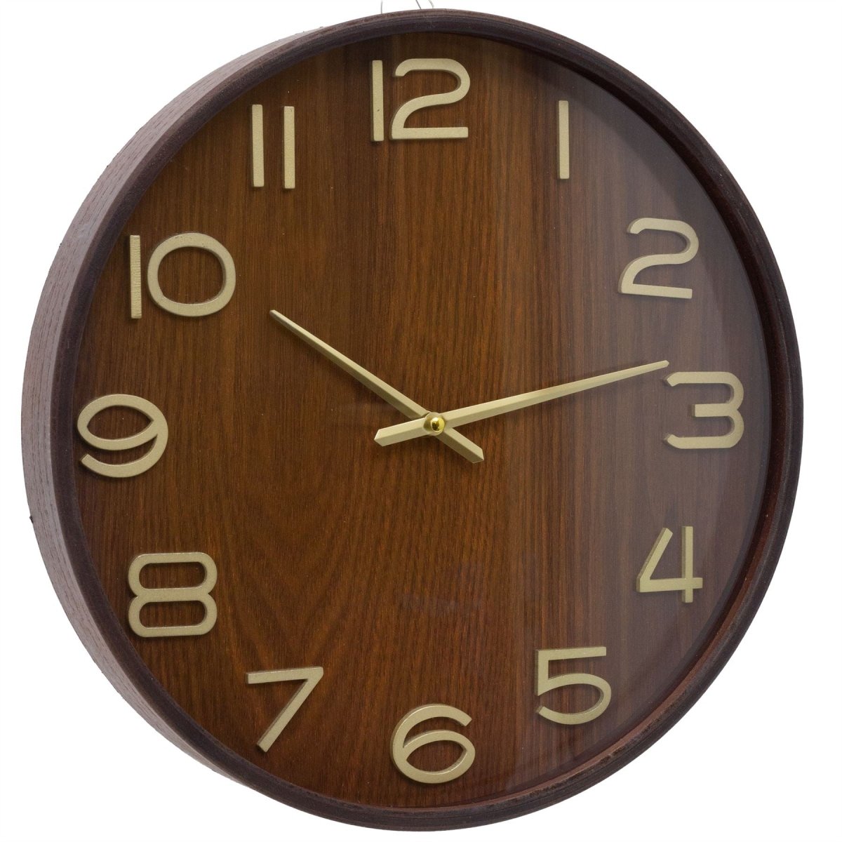 A round dark wood wall clock with gold hands, ideal for kitchens, living rooms, or offices. Its clean wood effect look suits both classic and modern interiors while keeping time clear and easy to read