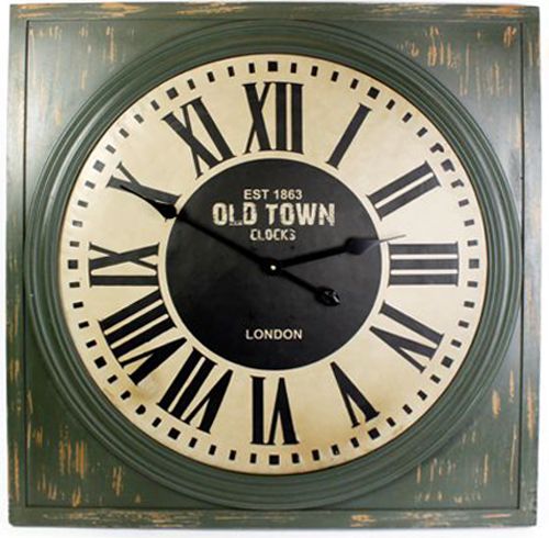 A rather stunning wall clock produced in MDF. With a distinctly shabby chic feel the olive green square surround is weathered. The numerals are easy to read and the clock features delightful olde worlde writing in the middle. Requires 1 x AA battery.