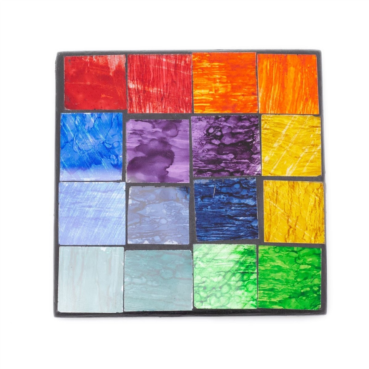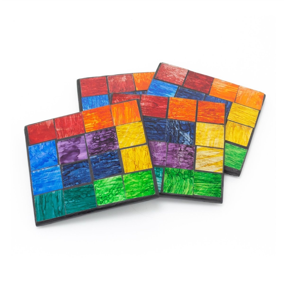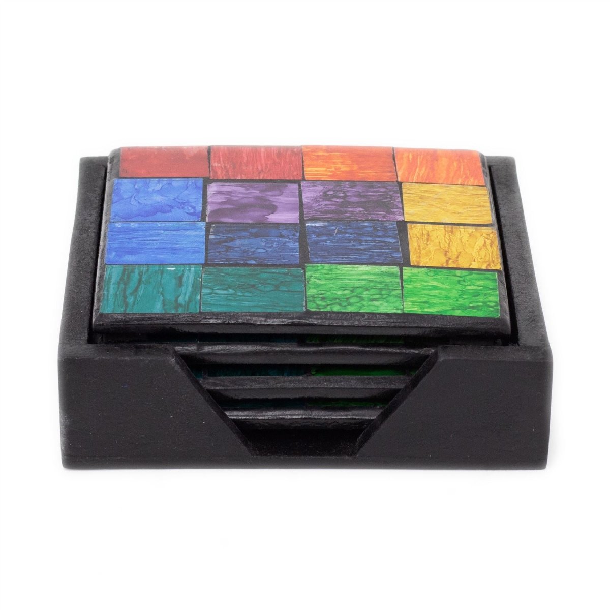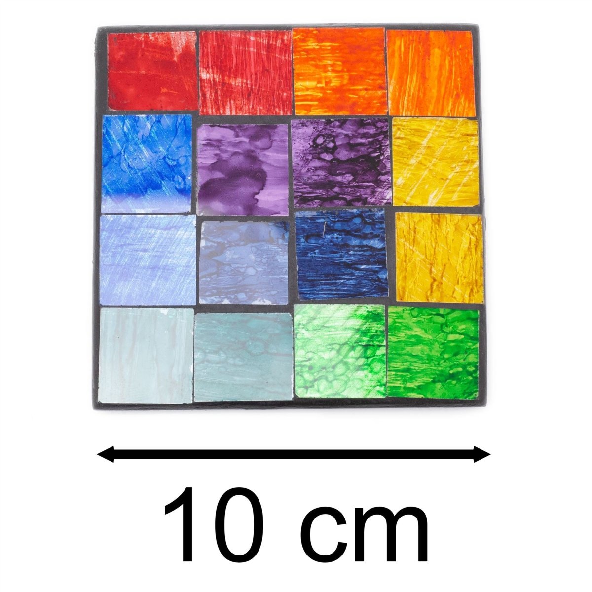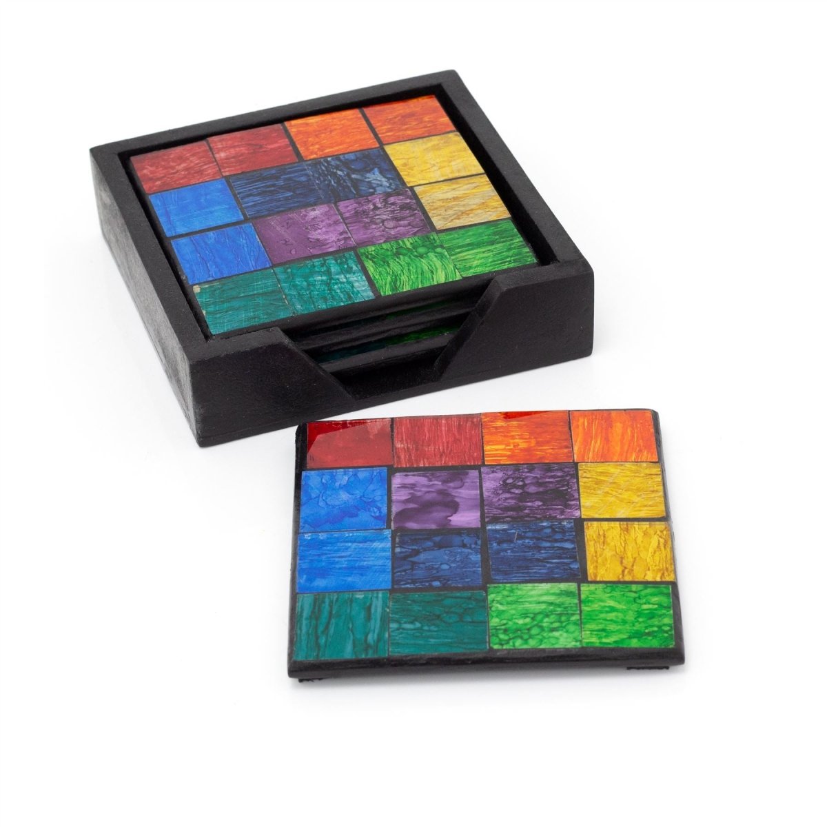 Rainbow Mosaic Set Of 4 Coasters And Holder | Square Coasters With Holder Cup Mug Table Mats | Handmade 4 Piece Drinks Coaster Set