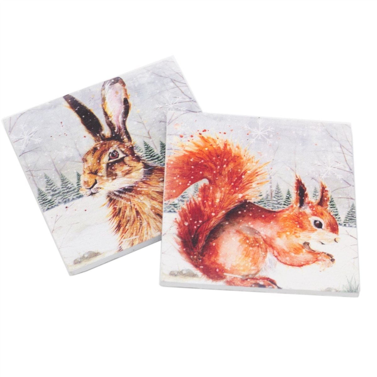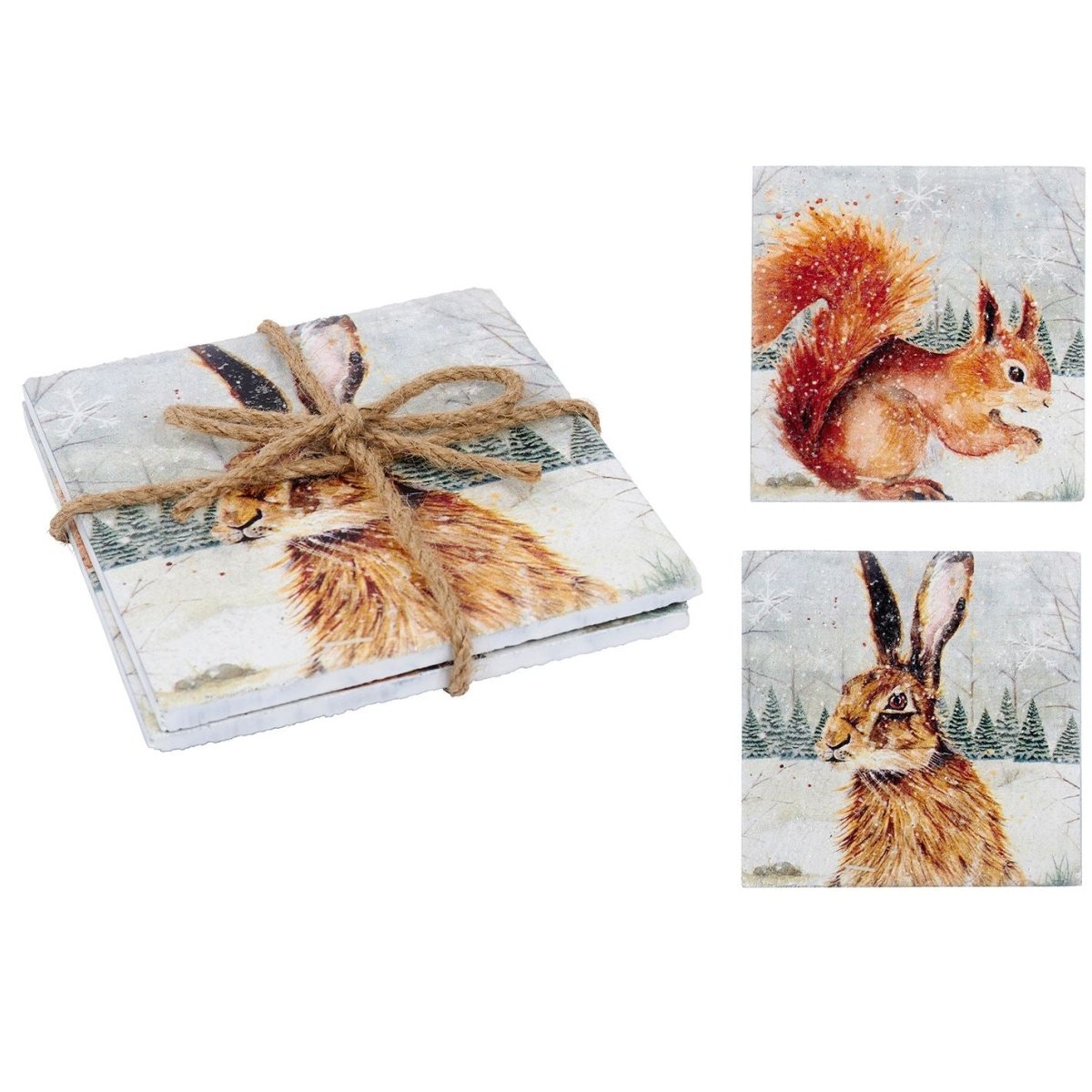 SLATE COASTERS: This drinks coasters set will add a country feel to any home bar, coffee table, dining table or kitchen island - protecting your surfaces from water marks and rings. Features two beautifully illustrated winter woodland scenes, each mat has been individually cut from genuine, natural slate to give a unique finish
