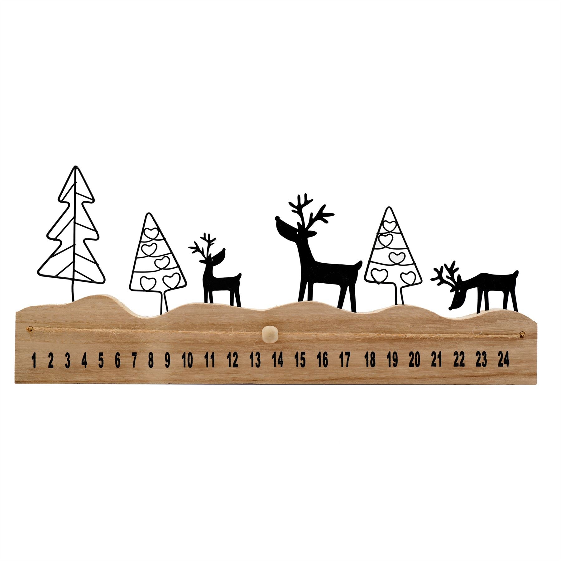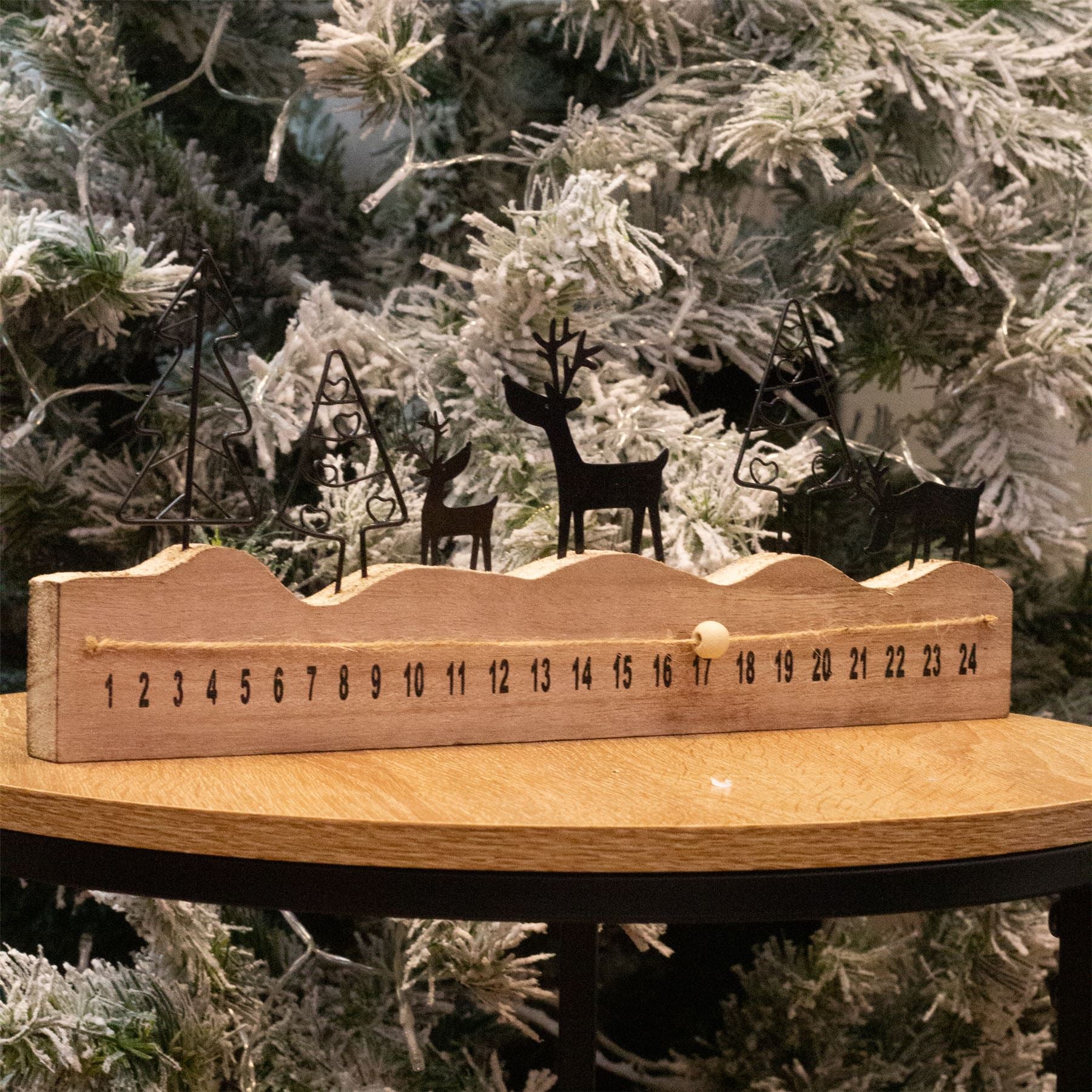 Embrace the festive spirit with our Reindeer Scene Christmas Advent Calendar. This reusable calendar features a captivating Alpine forest design with a black metal reindeer family, set on a wooden base. With its interactive sliding bead system, it's a delightful way for the entire family to countdown to Christmas