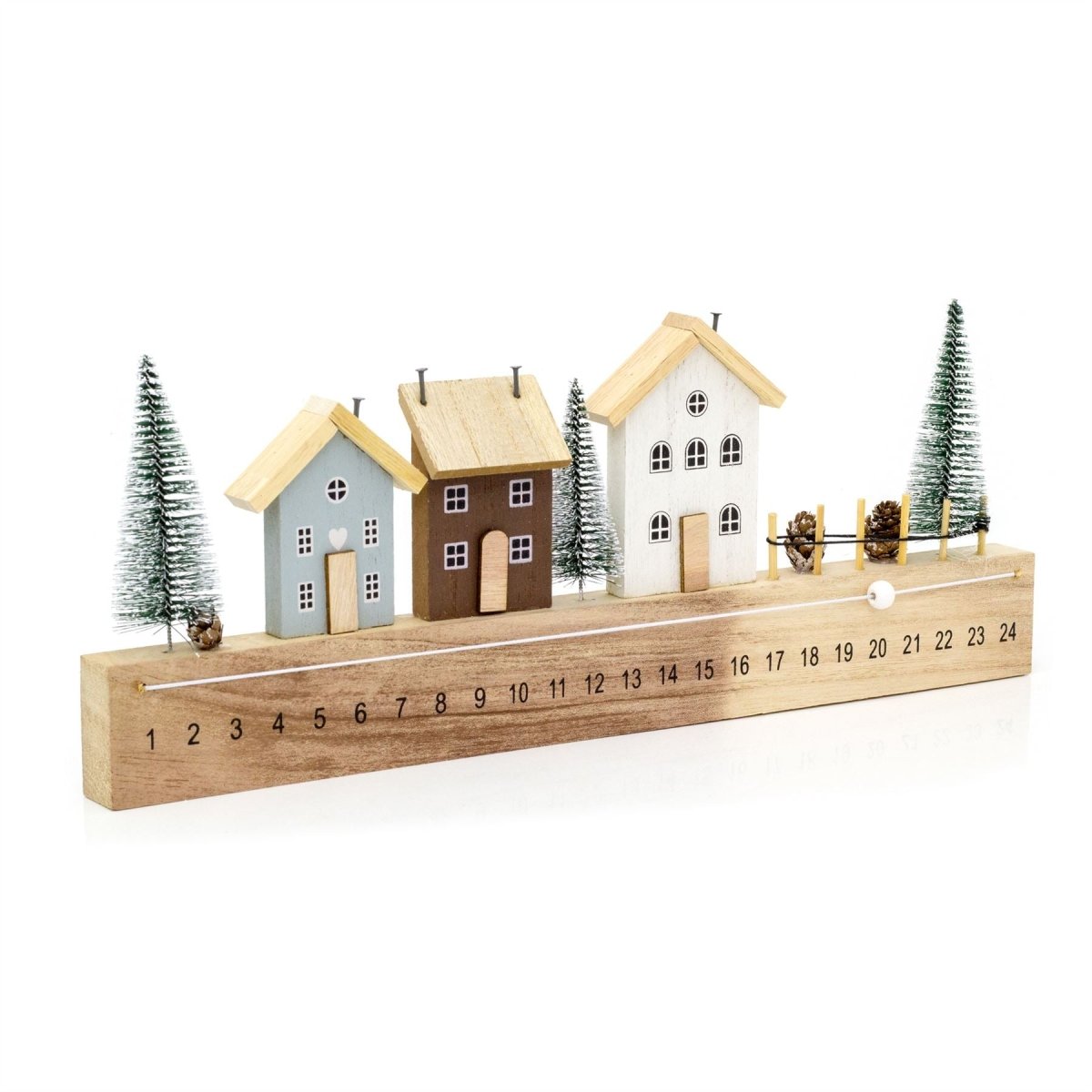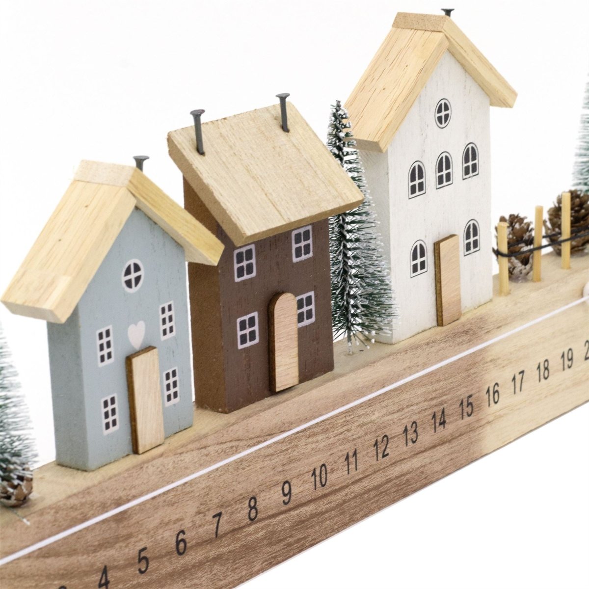 CHARMING TOWNHOUSE SCENE | Countdown to Christmas with our Townhouse Christmas Advent Calendar. This charming wooden calendar features a lovely row of detailed townhouses adorned with pinecones and bottlebrush Christmas trees, creating an enchanting festive scene