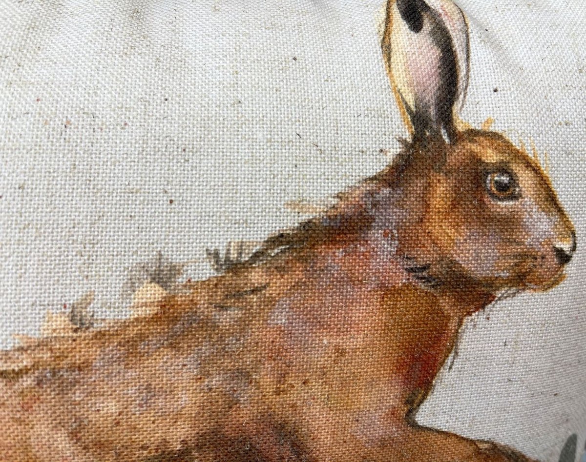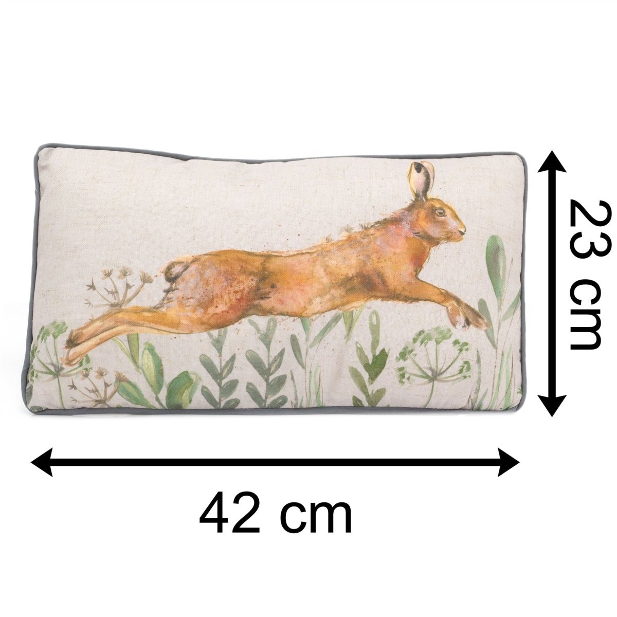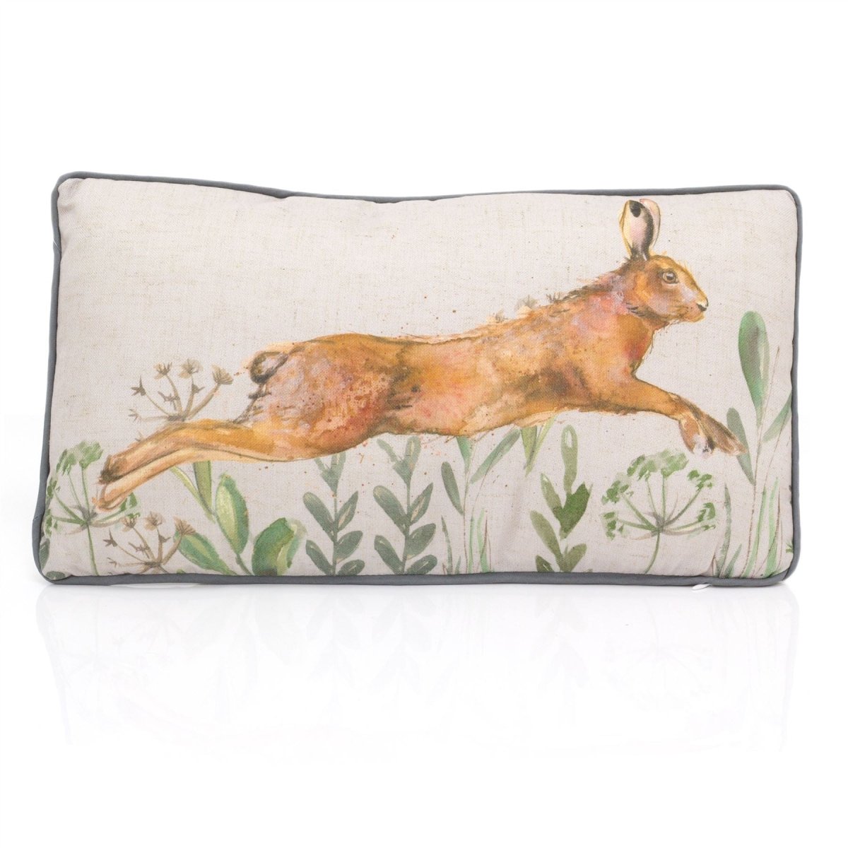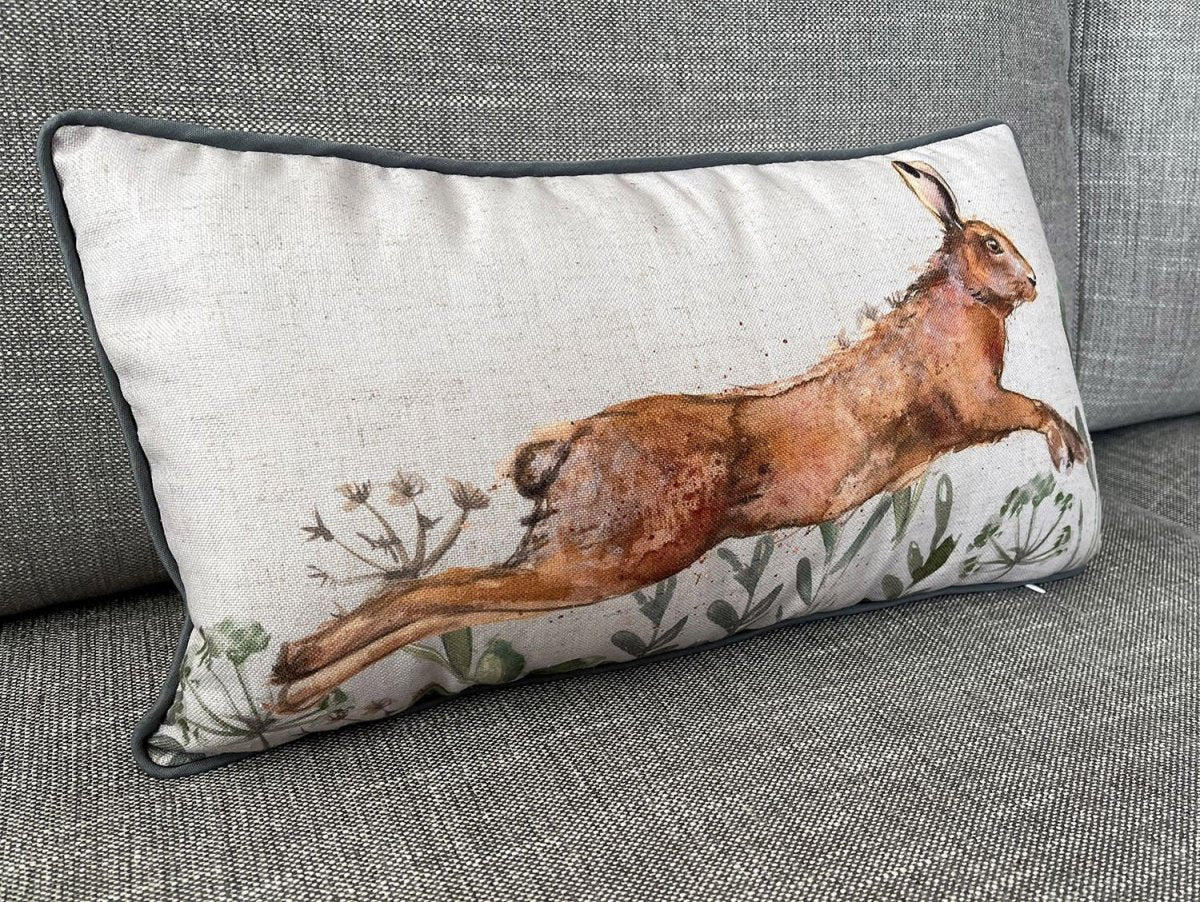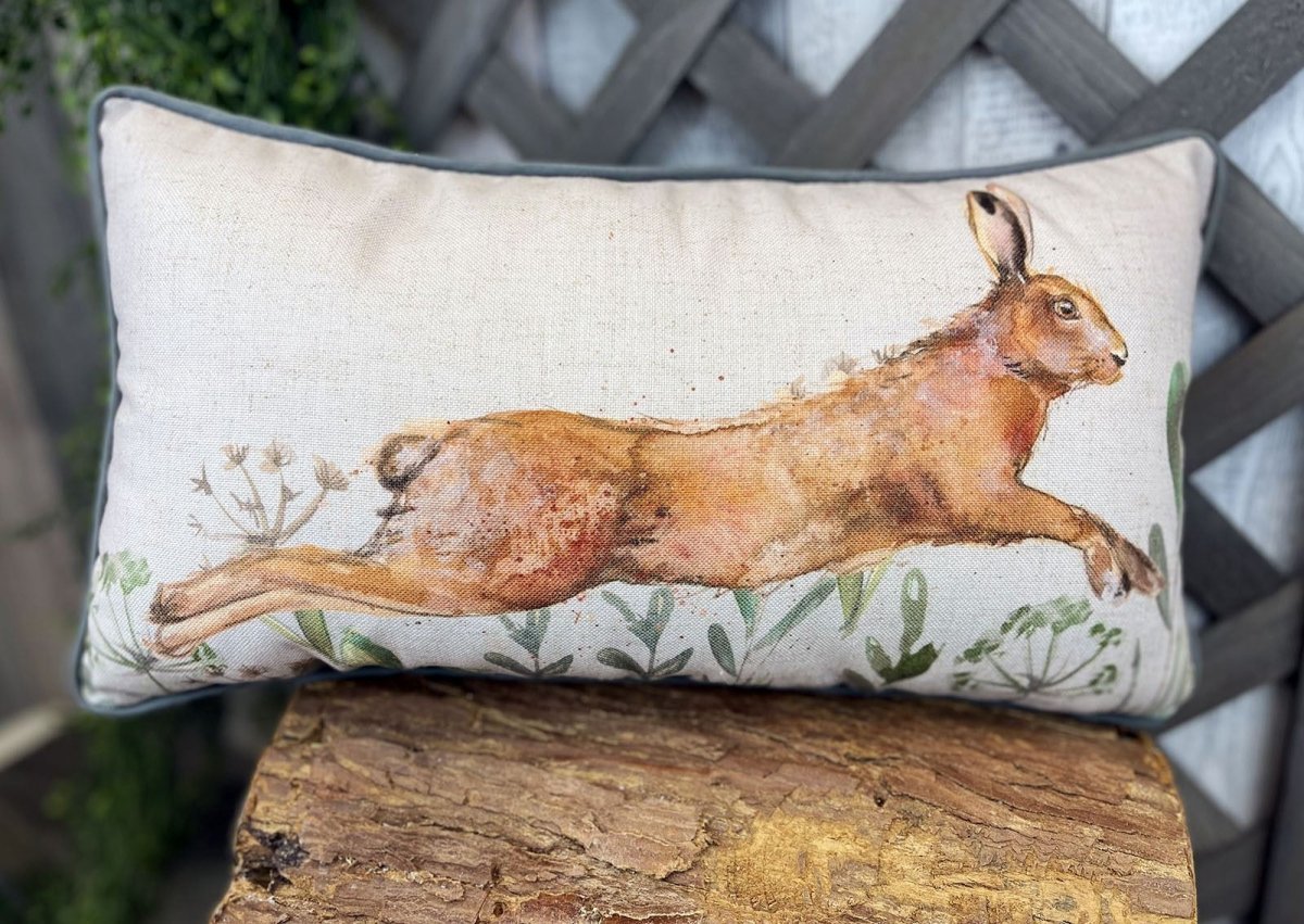 THROW PILLOW: A gorgeous linen style fabric with a marvellous print of a leaping hare. Ideal accessory for your sofa, bed or garden furniture