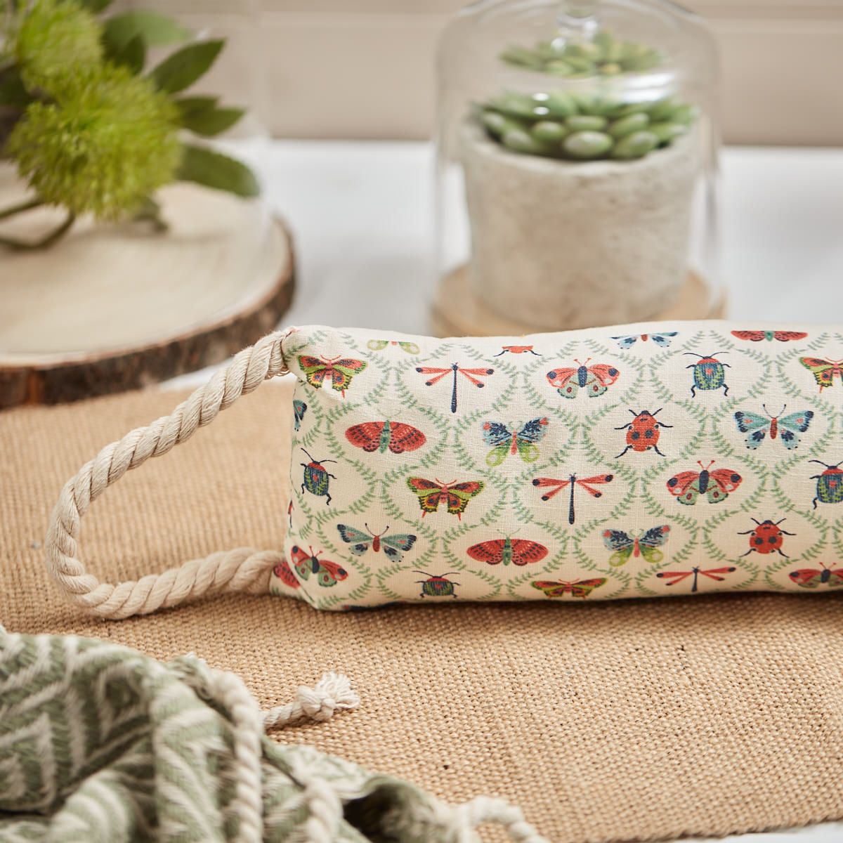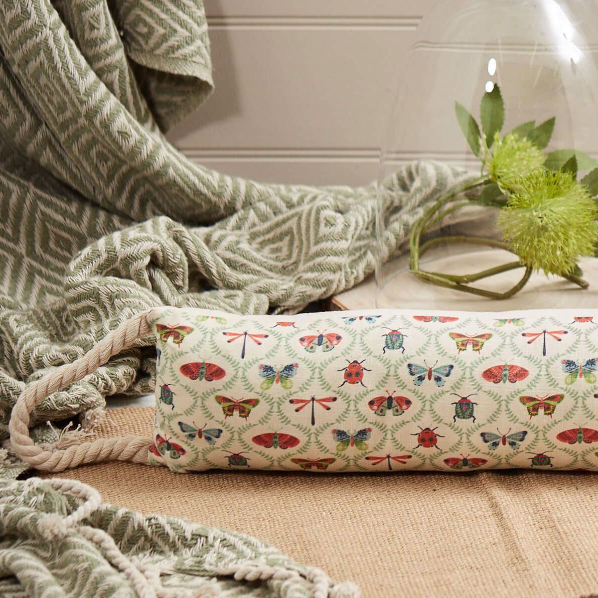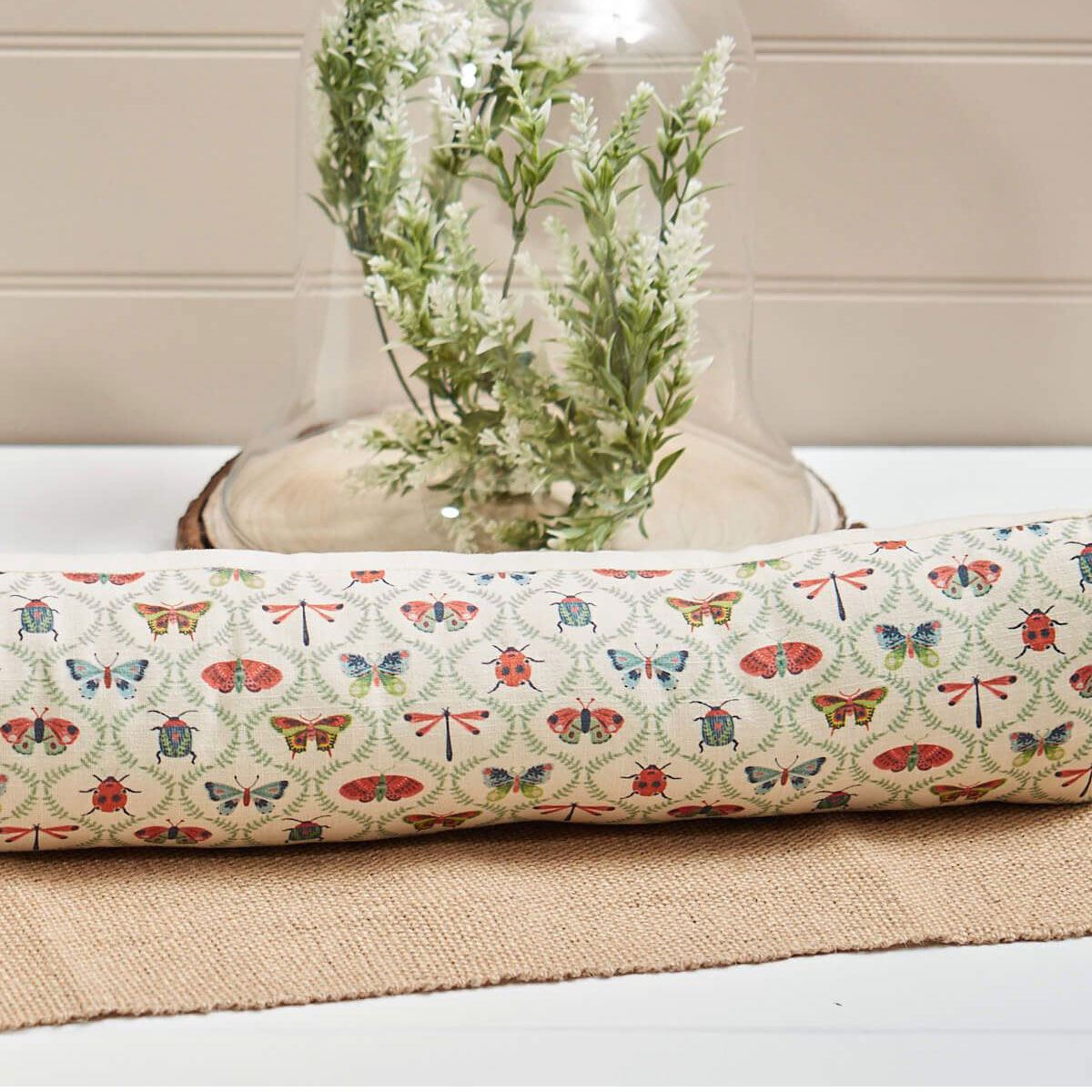 DRAUGHT EXCLUDER | Bring a playful touch of the outdoors into your home with our Butterfly & Insect Draught Excluder. Featuring charming red and blue insects on a soft cream background, it adds a rustic, cottage-core vibe to any space