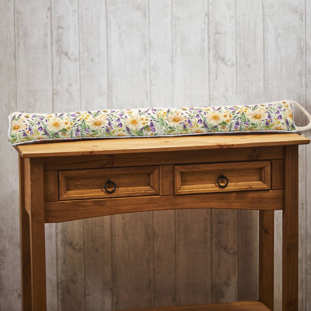 DRAUGHT EXCLUDER | Stay cosy and stylish with our Daisy & Lavender Draught Excluder. Featuring a delightful blend of daisies, lavender, and honeybees on a soft cream background, this floral design brings a refreshing touch of nature to any room